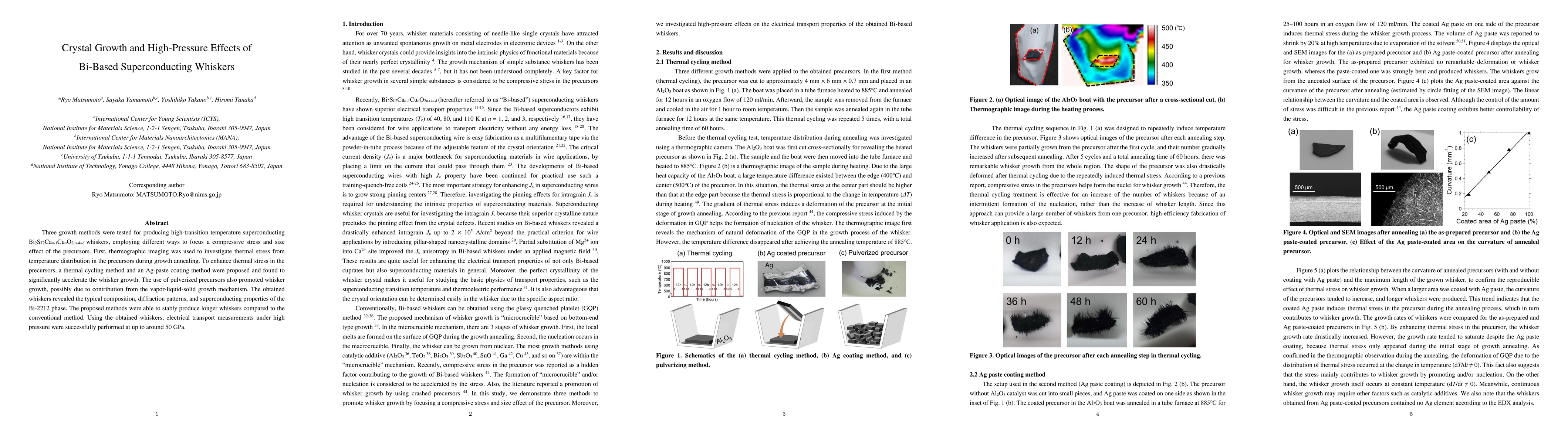 This study investigates three growth methods to produce high-transition temperature superconducting Bi-based whiskers, finding that thermal cycling and Ag-paste coating significantly accelerate growth. High-pressure electrical transport measurements revealed stable superconducting properties up to 50 GPa.