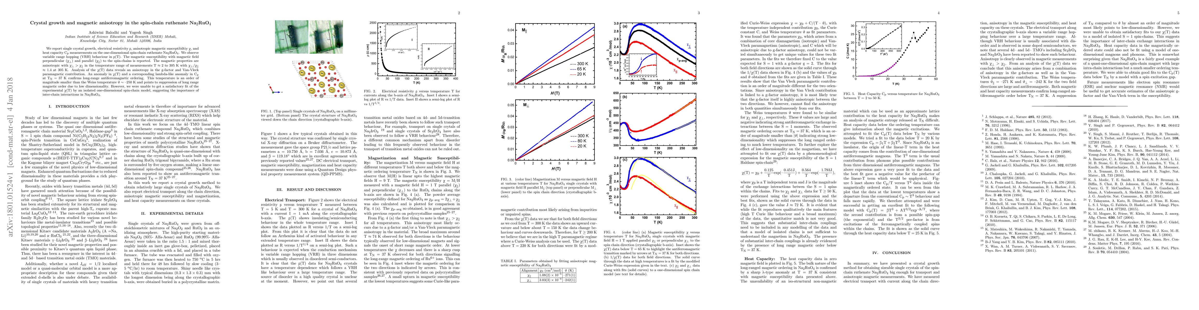 We report single crystal growth, electrical resistivity $\rho$, anisotropic magnetic susceptibiltiy $\chi$, and heat capacity $C_p$ measurements on the one-dimensional spin-chain ruthenate Na$_2$RuO$_4$. We observe variable range hopping (VRH) behaviour in $\rho(T)$. The magnetic susceptibility with magnetic field perpendicular ($\chi_\perp$) and parallel ($\chi_\parallel$) to the spin-chains is reported. The magnetic properties are anisotropic with $\chi_\perp > \chi_\parallel$ in the temperature range of measurements T $\approx 2$ to $305$ K with $\chi_\perp / \chi_\parallel$ $\approx 1.4$ at $305$ K. Analysis of the $\chi(T)$ data reveals an anisotropy in the $g$-factor and Van-Vleck paramagnetic contribution. An anomaly in $\chi(T)$ and a corresponding lambda-like anomaly in $C_p$ at $T_N = 37$ K confirms long-range antiferromagnetic ordering. This temperature is an order of magnitude smaller than the Weiss temperature $\theta \sim -250$ K and points to suppression of long range magnetic order due to low dimensionality. However, we were unable to get a satisfactory fit of the experimental $\chi(T)$ by an isolated one-dimensional spin-chain model, suggesting the importance of inter-chain interactions in Na$_2$RuO$_4$.