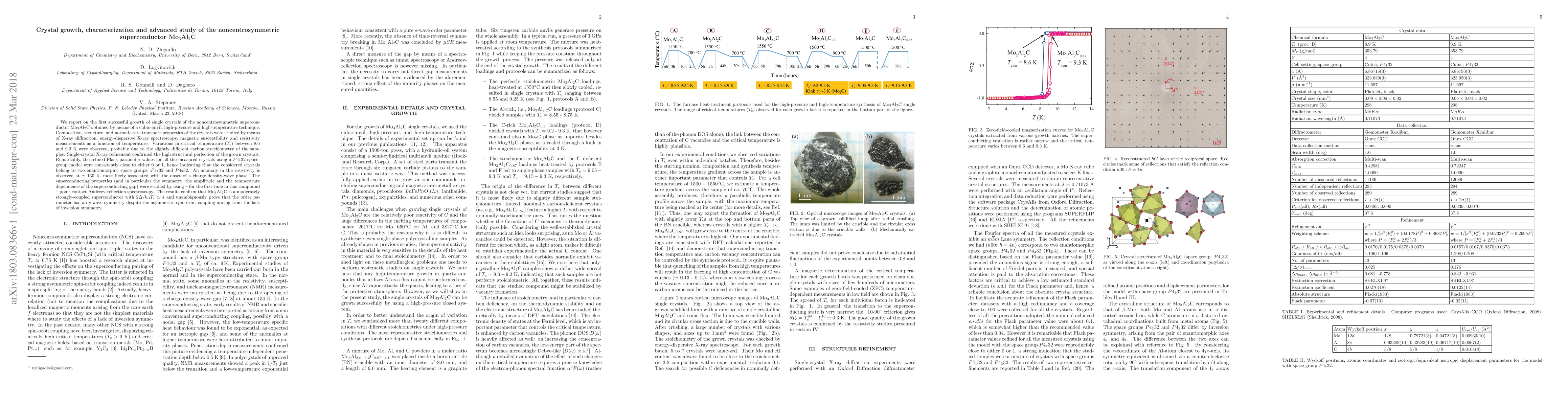 This paper reports the first growth of single crystals of the noncentrosymmetric superconductor Mo$_3$Al$_2$C using high-pressure and high-temperature techniques. The study reveals variations in critical temperature and identifies the compound's space groups, while point contact Andreev-reflection spectroscopy confirms its s-wave symmetry superconducting gap.