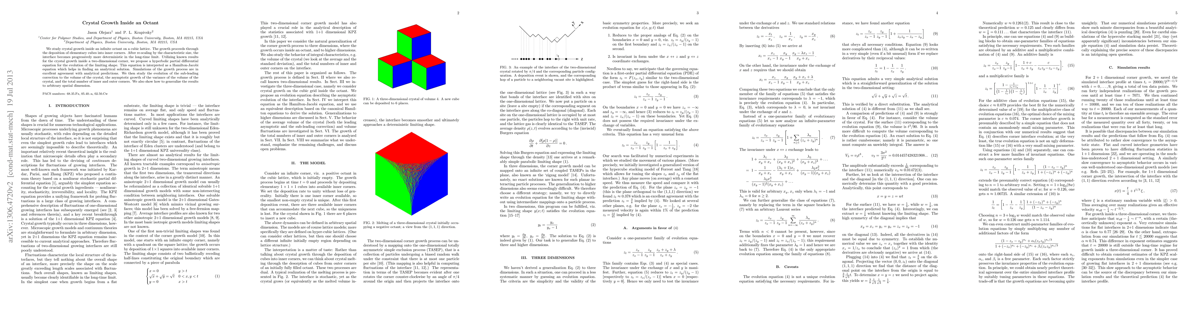 This paper investigates crystal growth within an infinite octant on a cubic lattice, proposing a hyperbolic partial differential equation for the evolution of the crystal's limiting shape. Analytical solutions and simulations align well, and the study extends to the variance of crystal volume and generalization to higher dimensions.