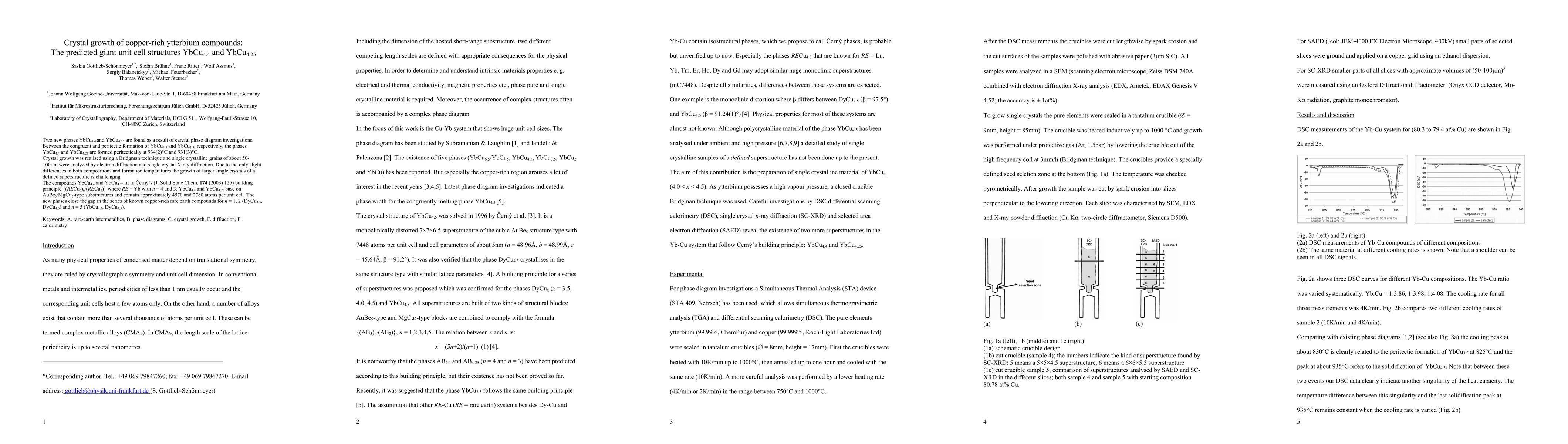 Two new phases YbCu4.4 and YbCu4.25 are found as a result of careful phase diagram investigations. Between the congruent and peritectic formation of YbCu4.5 and YbCu3.5, respectively, the phases YbCu4.4 and YbCu4.25 are formed peritectically at 934(2)degC and 931(3)degC. Crystal growth was realised using a Bridgman technique and single crystalline grains of about 50-100 10^{-6}m were analyzed by electron diffraction and single crystal X-ray diffraction. Due to the only slight differences in both compositions and formation temperatures the growth of larger single crystals of a defined superstructure is challenging. The compounds YbCu4.4 and YbCu4.25 fit in Cerny`s (J. Solid State Chem. 174 (2003) 125) building principle {(RECu5)n(RECu2)} where RE = Yb with n = 4 and 3. YbCu4.4 and YbCu4.25 base on AuBe5/MgCu2-type substructures and contain approximately 4570 and 2780 atoms per unit cell. The new phases close the gap in the series of known copper-rich rare earth compounds for n = 1, 2 (DyCu3.5, DyCu4.0) and n = 5 (YbCu4.5, DyCu4.5).