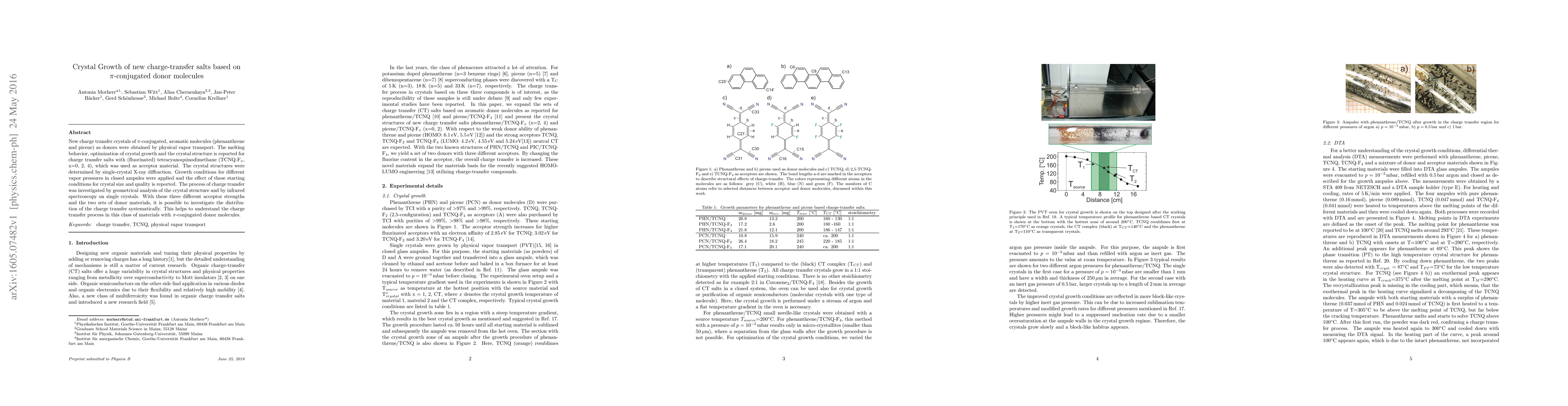 New charge transfer crystals of $\pi$-conjugated, aromatic molecules (phenanthrene and picene) as donors were obtained by physical vapor transport. The melting behavior, optimization of crystal growth and the crystal structure is reported for charge transfer salts with (fluorinated) tetracyanoquinodimethane (TCNQ-F$_x$, x=0, 2, 4), which was used as acceptor material. The crystal structures were determined by single-crystal X-ray diffraction. Growth conditions for different vapor pressures in closed ampules were applied and the effect of these starting conditions for crystal size and quality is reported. The process of charge transfer was investigated by geometrical analysis of the crystal structure and by infrared spectroscopy on single crystals. With these three different acceptor strengths and the two sets of donor materials, it is possible to investigate the distribution of the charge transfer systematically. This helps to understand the charge transfer process in this class of materials with $\pi$-conjugated donor molecules.