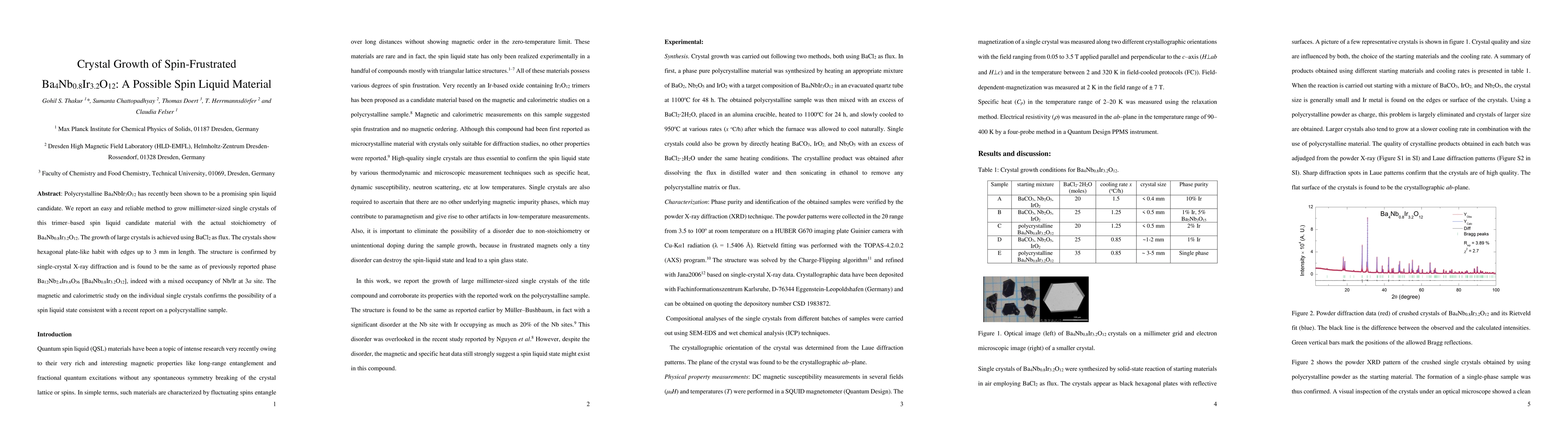 Polycrystalline Ba4NbIr3O12 has recently been shown to be a promising spin liquid candidate. We report an easy and reliable method to grow millimeter-sized single crystals of this trimer based spin liquid candidate material with the actual stoichiometry of Ba4Nb0.8Ir3.2O12. The growth of large crystals is achieved using BaCl2 as flux. The crystals show hexagonal plate-like habit with edges up to 3 mm in length. The structure is confirmed by single crystal X-ray diffraction and is found to be the same as of previously reported phase Ba12Nb2.4Ir9.6O36 [Ba4Nb0.8Ir3.2O12], indeed with a mixed occupancy of Nb/Ir at 3a site. The magnetic and calorimetric study on the individual single crystals confirms the possibility of a spin liquid state consistent with a recent report on a polycrystalline sample