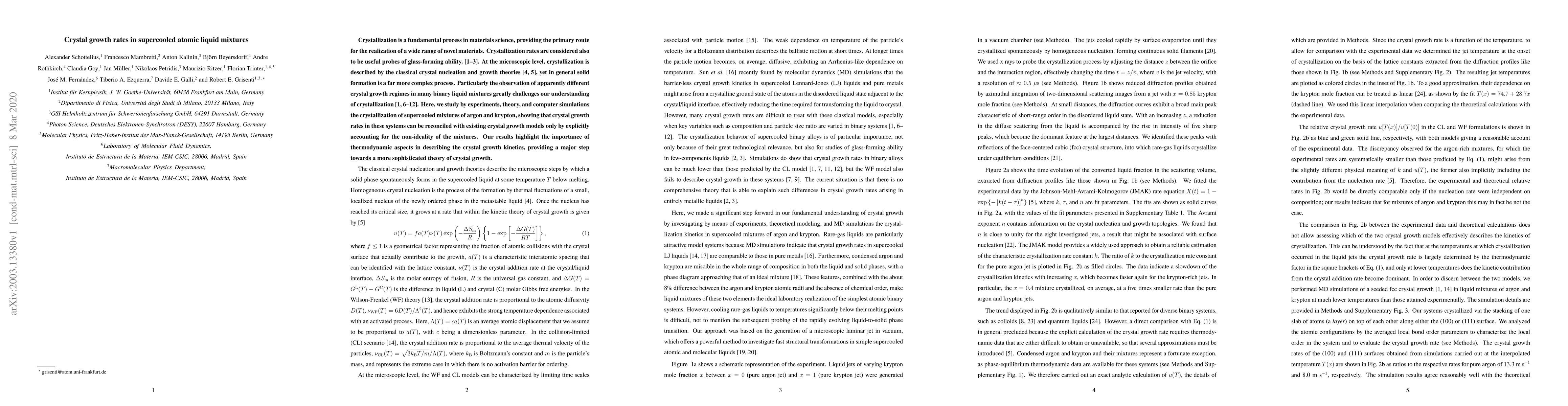 This paper investigates the crystallization process in supercooled mixtures of argon and krypton, revealing that traditional crystal growth models require adjustments to account for the non-ideality of the mixtures. The findings underscore the importance of thermodynamic considerations in crystal growth kinetics and advance the theoretical framework for understanding complex crystallization behaviors.