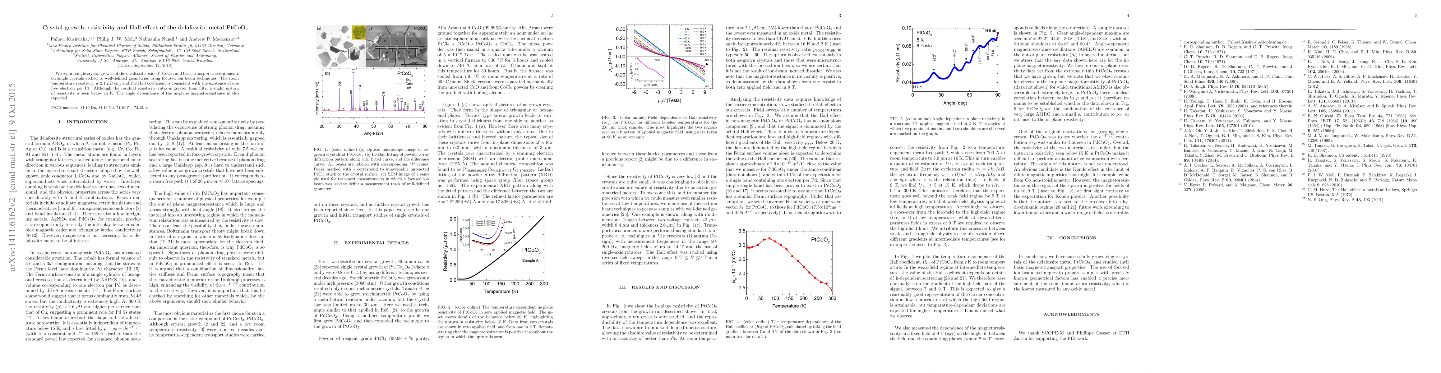The paper details the successful cultivation of single crystals of the delafossite oxide PtCoO2, and the measurement of its electrical properties. Key findings include a room temperature resistivity of 2.1 $muOmega$ cm and a Hall coefficient indicating one free electron per Pt atom. Despite a high residual resistivity ratio, a resistivity upturn is observed below 15 K. The angle-dependent in-plane magnetoresistance is also reported.