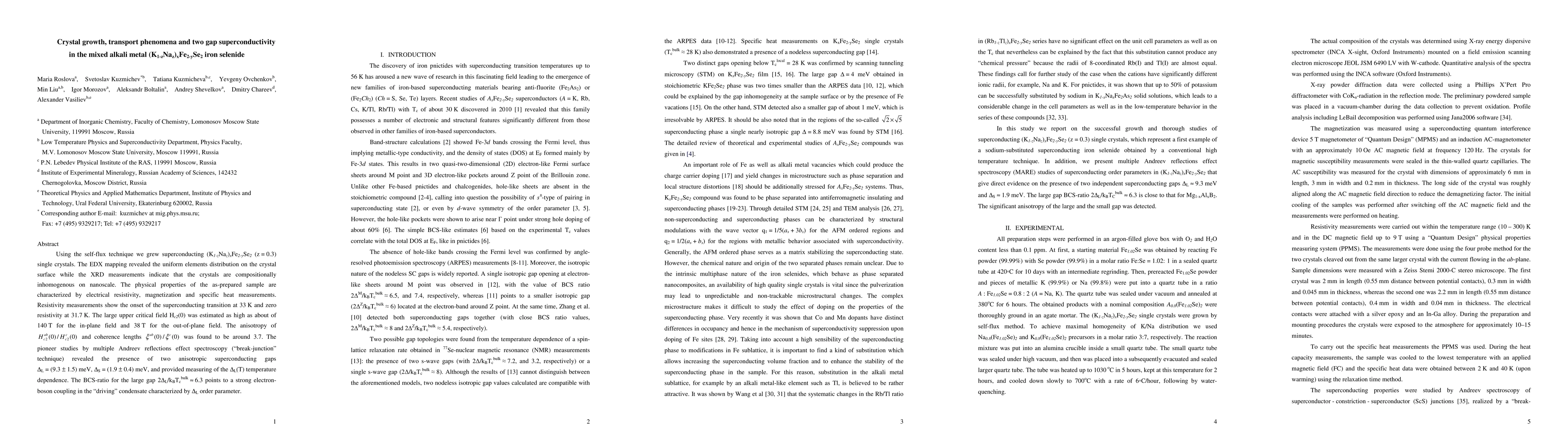 Using the self-flux technique we grew superconducting $(K_{1-z}Na_z)_{x}Fe_{2-y}Se_2$ (z = 0.3) single crystals. The EDX mapping revealed the uniform elements distribution on the crystal surface while the XRD measurements indicate that the crystals are compositionally inhomogenous on nanoscale. The physical properties of the as-prepared sample are characterized by electrical resistivity, magnetization and specific heat measurements. Resistivity measurements show the onset of the superconducting transition at 33 K and zero resistivity at 31.7 K. The large upper critical field $H_{c2}$(0) was estimated as high as about of 140 T for the in-plane field and 38 T for the out-of-plane field. The anisotropy of $H_{c2}^{ab}(0)/H_{c2}^{c}(0)$ and coherence lengths $\xi^{ab}(0)/\xi^{c}$(0) was found to be around 3.7. The pioneer studies by multiple Andreev reflections effect spectroscopy ("break-junction" technique) revealed the presence of two anisotropic superconducting gaps $\Delta_L\,=\,(9.3\pm1.5)\,meV$, $\Delta_S\,=\,(1.9\pm0.4)\,meV$, and provided measuring of the $\Delta_L$(T) temperature dependence. The BCS-ratio for the large gap $2\Delta_L/k_BT_c^{bulk}\,\approx\,6.3$ points to a strong electron-boson coupling in the "driving" condensate characterized by $\Delta_L$ order parameter.
