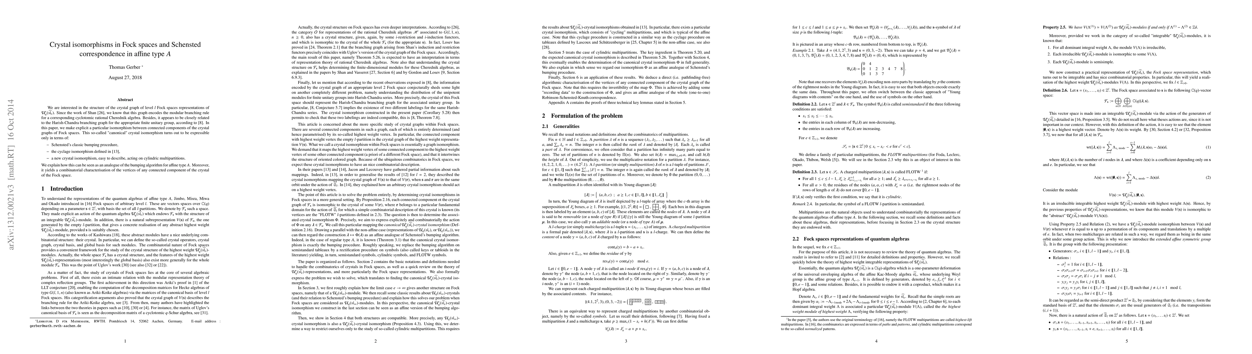 We are interested in the structure of the crystal graph of level $l$ Fock spaces representations of $\mathcal{U}_q (\widehat{\mathfrak{sl}_e})$. Since the work of Shan [26], we know that this graph encodes the modular branching rule for a corresponding cyclotomic rational Cherednik algebra. Besides, it appears to be closely related to the Harish-Chandra branching graph for the appropriate finite unitary group, according to [8]. In this paper, we make explicit a particular isomorphism between connected components of the crystal graphs of Fock spaces. This so-called "canonical" crystal isomorphism turns out to be expressible only in terms of: - Schensted's classic bumping procedure, - the cyclage isomorphism defined in [13], - a new crystal isomorphism, easy to describe, acting on cylindric multipartitions. We explain how this can be seen as an analogue of the bumping algorithm for affine type $A$. Moreover, it yields a combinatorial characterisation of the vertices of any connected component of the crystal of the Fock space.