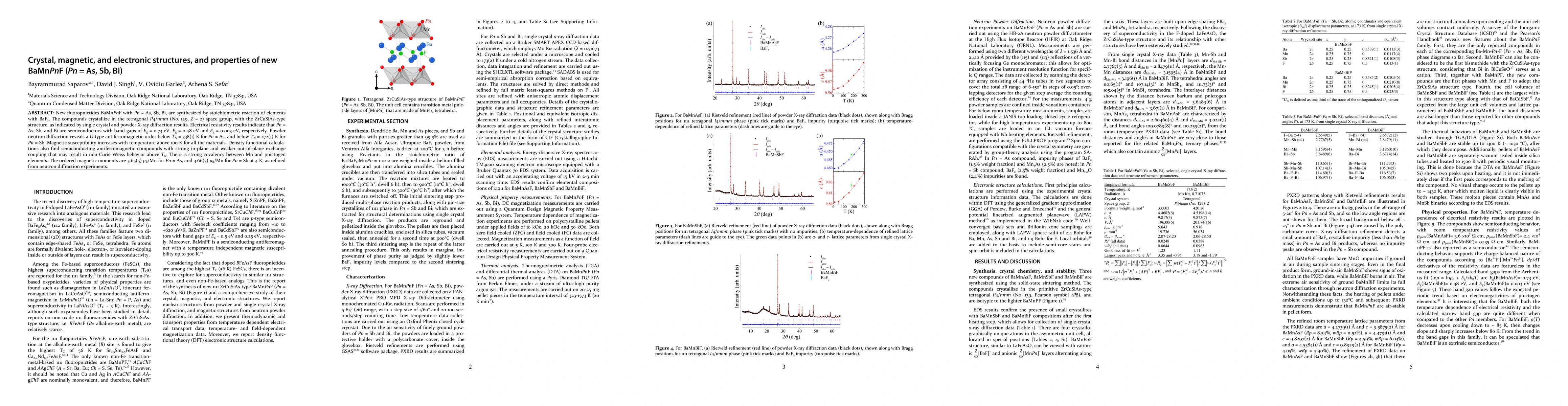 New BaMnPnF (Pn = As, Sb, Bi) fluoropnictides exhibit tetragonal P4/nmm crystal structures and semiconducting behavior with varying band gaps. Antiferromagnetic ordering is observed below specific Néel temperatures, with strong covalency between Mn and pnictogen elements.