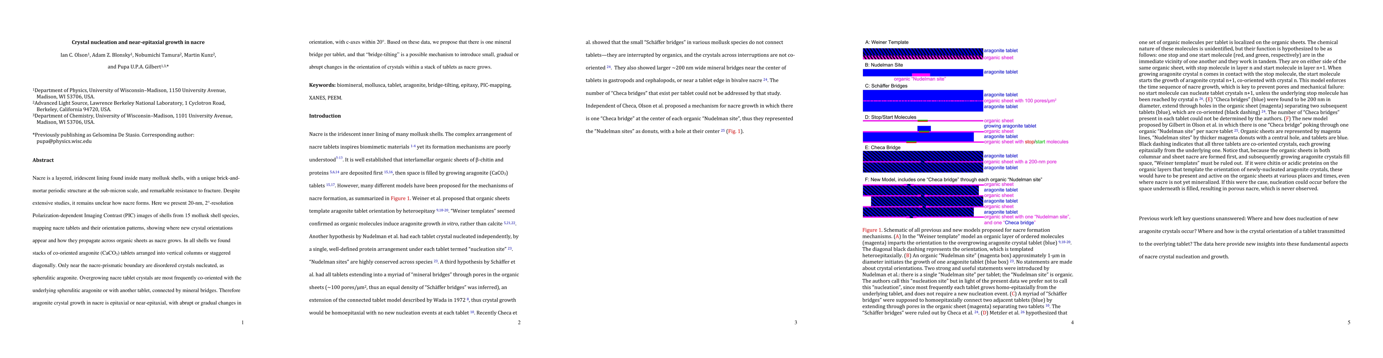 This study reveals the nucleation and growth patterns of nacre in mollusk shells using high-resolution imaging, showing that aragonite tablets grow in near-epitaxial alignment connected by mineral bridges, suggesting a mechanism for orientation changes during nacre formation.