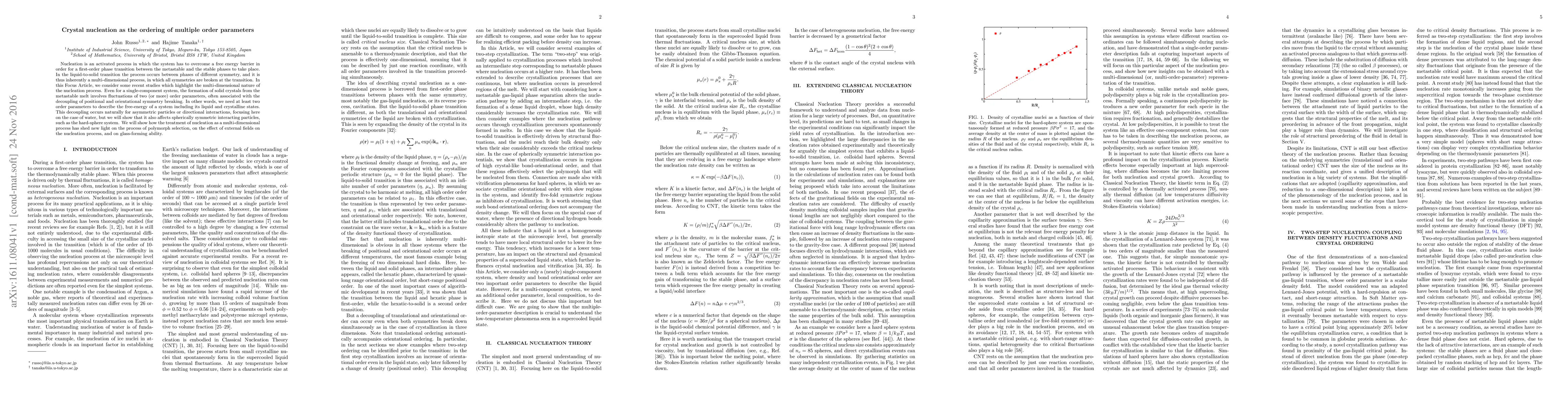 Nucleation is an activated process in which the system has to overcome a free energy barrier in order for a first-order phase transition between the metastable and the stable phases to take place. In the liquid-to-solid transition the process occurs between phases of different symmetry, and it is thus inherently a multi-dimensional process, in which all symmetries are broken at the transition. In this Focus Article, we consider some recent studies which highlight the multi-dimensional nature of the nucleation process. Even for a single-component system, the formation of solid crystals from the metastable melt involves fluctuations of two (or more) order parameters, often associated with the decoupling of positional and orientational symmetry breaking. In other words, we need at least two order parameters to describe the free-energy of a system including its liquid and crystalline states. This decoupling occurs naturally for asymmetric particles or directional interactions, focusing here on the case of water, but we will show that it also affects spherically symmetric interacting particles, such as the hard-sphere system. We will show how the treatment of nucleation as a multi-dimensional process has shed new light on the process of polymorph selection, on the effect of external fields on the nucleation process, and on glass-forming ability.