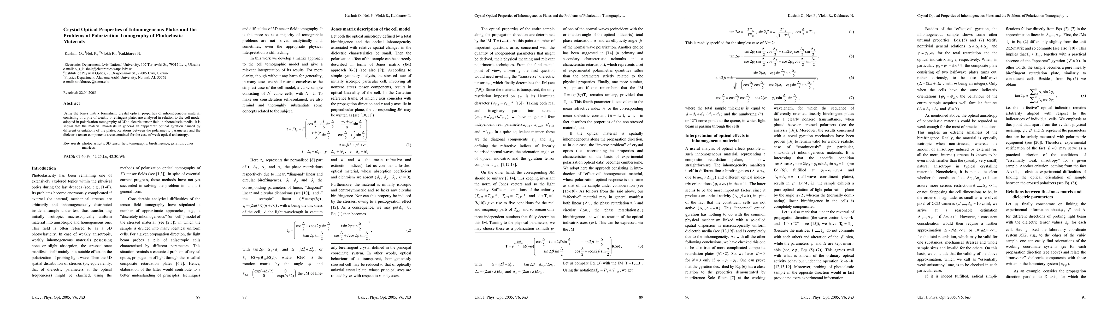 Using the Jones matrix formalism, crystal optical properties of inhomogeneous material consisting of a pile of weakly birefringent plates are analysed in relation to the cell model adopted in polarization tomography of 3D dielectric tensor field in photoelastic media. It is shown that the material manifests in general an "apparent" optical gyration caused by different orientations of the plates. Relations between the polarimetric parameters and the dielectric tensor components are ascertained for the case of weak optical anisotropy.