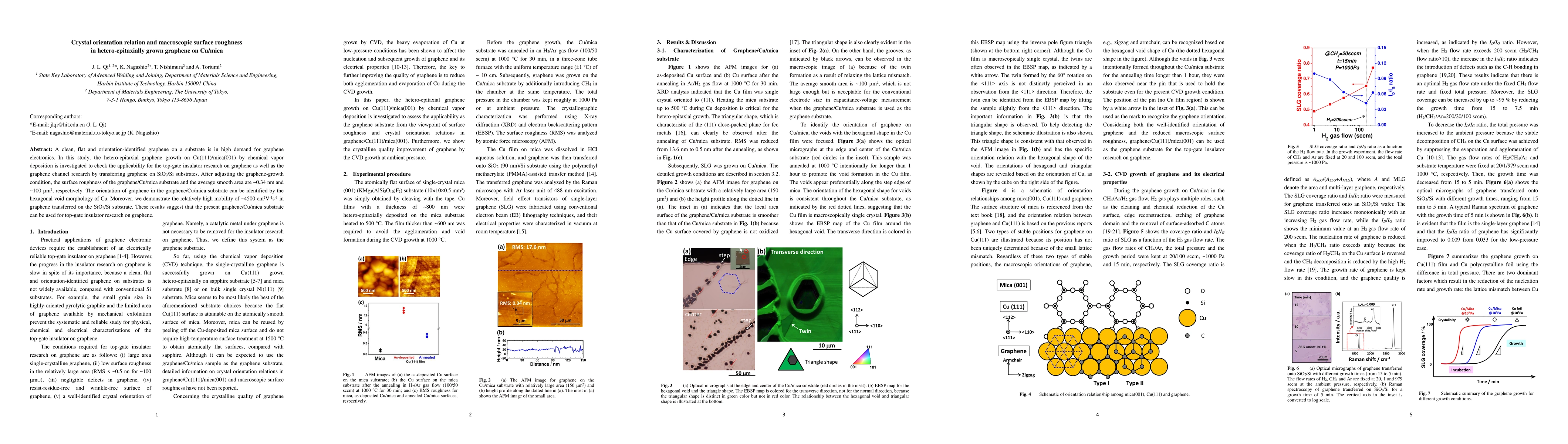 This study investigates the hetero-epitaxial growth of graphene on Cu/mica substrate via chemical vapor deposition, achieving a surface roughness of ~0.34 nm and a smooth area of ~100 um2. The graphene's high mobility of ~4500 cm2V-1s-1 suggests its potential for top-gate insulator and channel research.