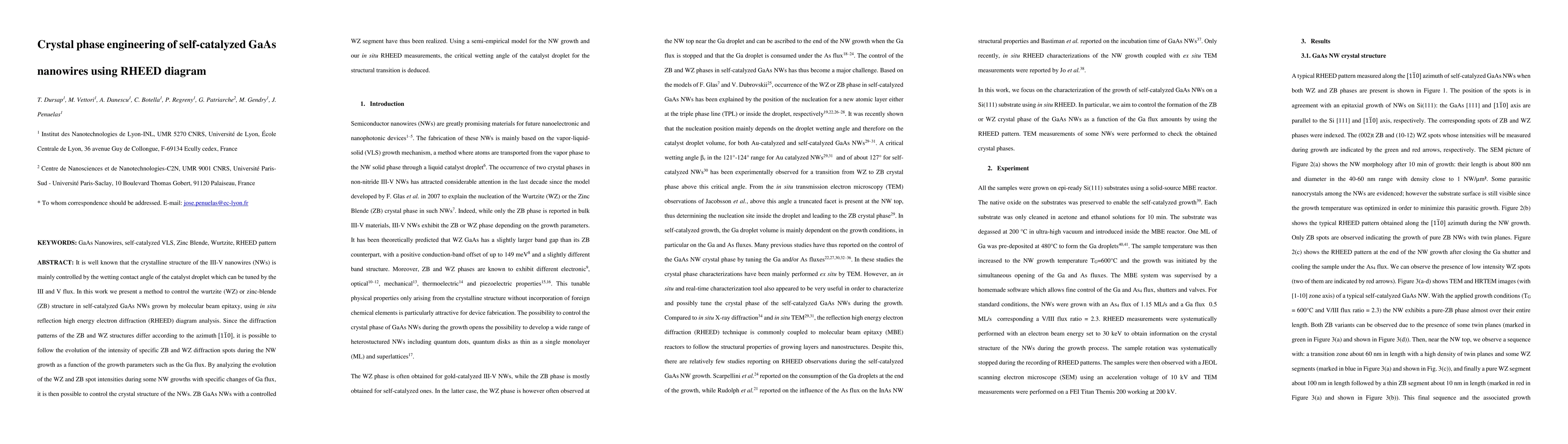 This paper presents a method to control the crystal phase of self-catalyzed GaAs nanowires (NWs) by tuning the Ga flux during growth using in situ reflection high energy electron diffraction (RHEED) analysis. The study successfully demonstrates the ability to switch between wurtzite and zinc-blende structures in GaAs NWs, achieving ZB NWs with controlled WZ segments.
