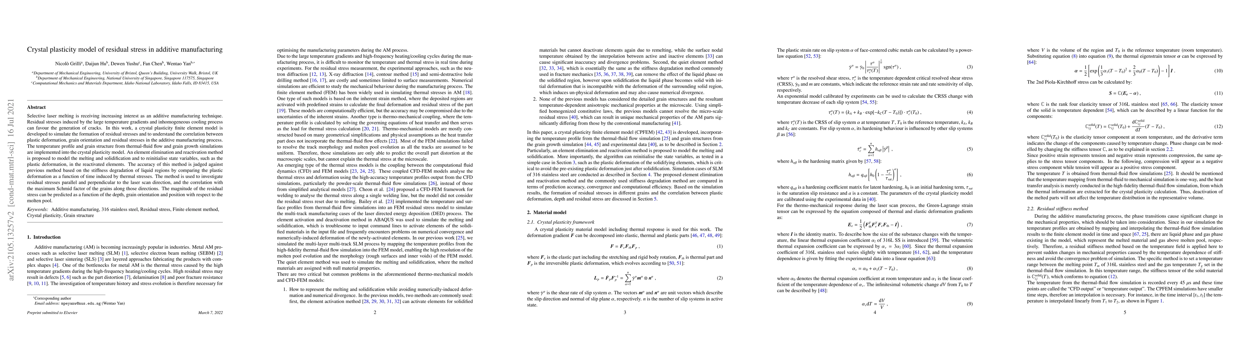 Selective laser melting is receiving increasing interest as an additive manufacturing technique. Residual stresses induced by the large temperature gradients and inhomogeneous cooling process can favour the generation of cracks. In this work, a crystal plasticity finite element model is developed to simulate the formation of residual stresses and to understand the correlation between plastic deformation, grain orientation and residual stresses in the additive manufacturing process. The temperature profile and grain structure from thermal-fluid flow and grain growth simulations are implemented into the crystal plasticity model. An element elimination and reactivation method is proposed to model the melting and solidification and to reinitialise state variables, such as the plastic deformation, in the reactivated elements. The accuracy of this method is judged against previous method based on the stiffness degradation of liquid regions by comparing the plastic deformation as a function of time induced by thermal stresses. The method is used to investigate residual stresses parallel and perpendicular to the laser scan direction, and the correlation with the maximum Schmid factor of the grains along those directions. The magnitude of the residual stress can be predicted as a function of the depth, grain orientation and position with respect to the molten pool.