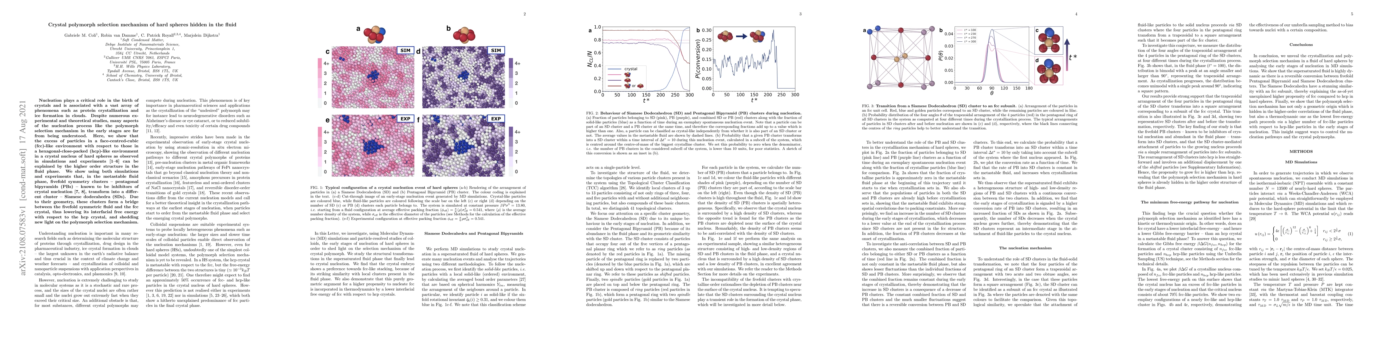 This paper investigates the nucleation process and polymorph selection in crystal formation, revealing that fivefold symmetry clusters in the metastable fluid phase transform into Siamese dodecahedra, bridging the gap between the fluid and face-centred-cubic crystals, thereby lowering the interfacial free energy and explaining the preference for fcc over hcp polymorphs.