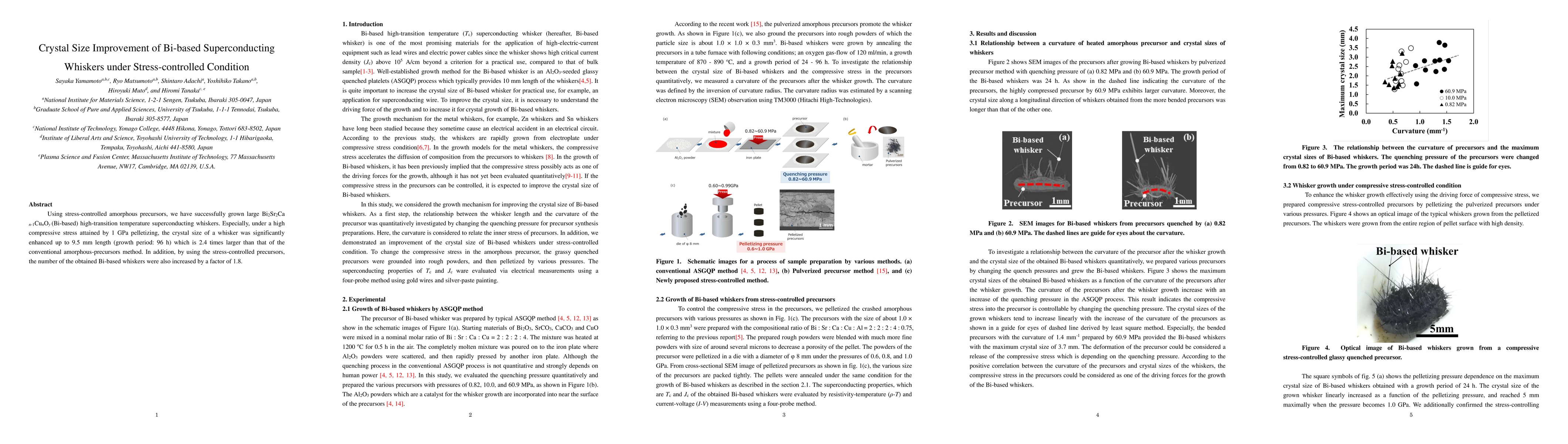 This paper reports the successful growth of large Bi-based superconducting whiskers using stress-controlled amorphous precursors, achieving a crystal size 2.4 times larger than conventional methods under 1 GPa compressive stress. The number of obtained whiskers also increased by a factor of 1.8.
