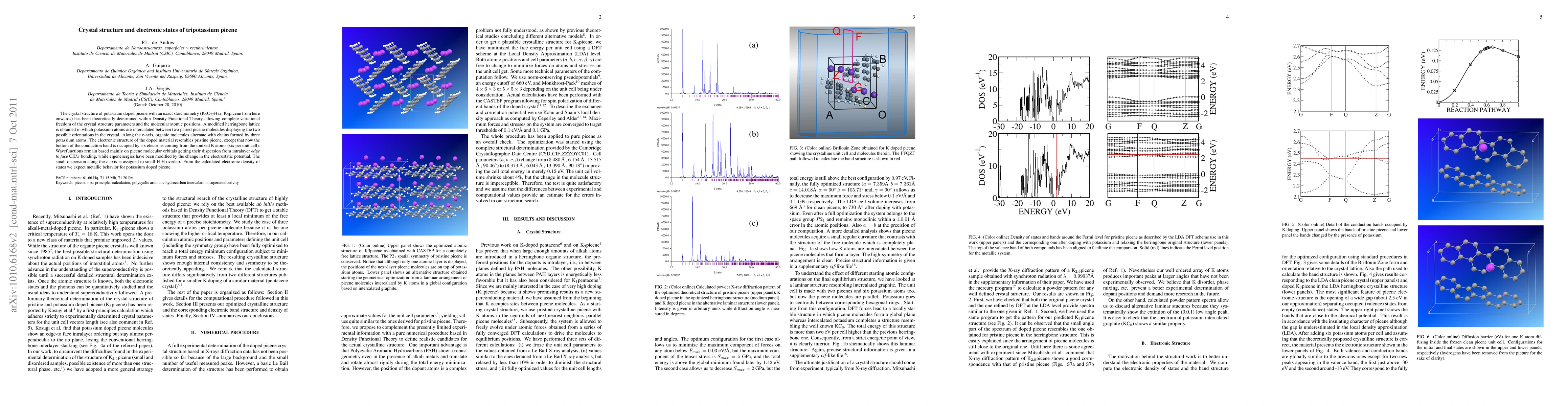 The crystal structure of K3picene features a modified herringbone lattice with potassium atoms intercalated between picene molecules, leading to metallic behavior due to conduction band occupation by electrons from ionized potassium atoms. Electronic states retain picene-based wavefunctions, modified by electrostatic potential changes.