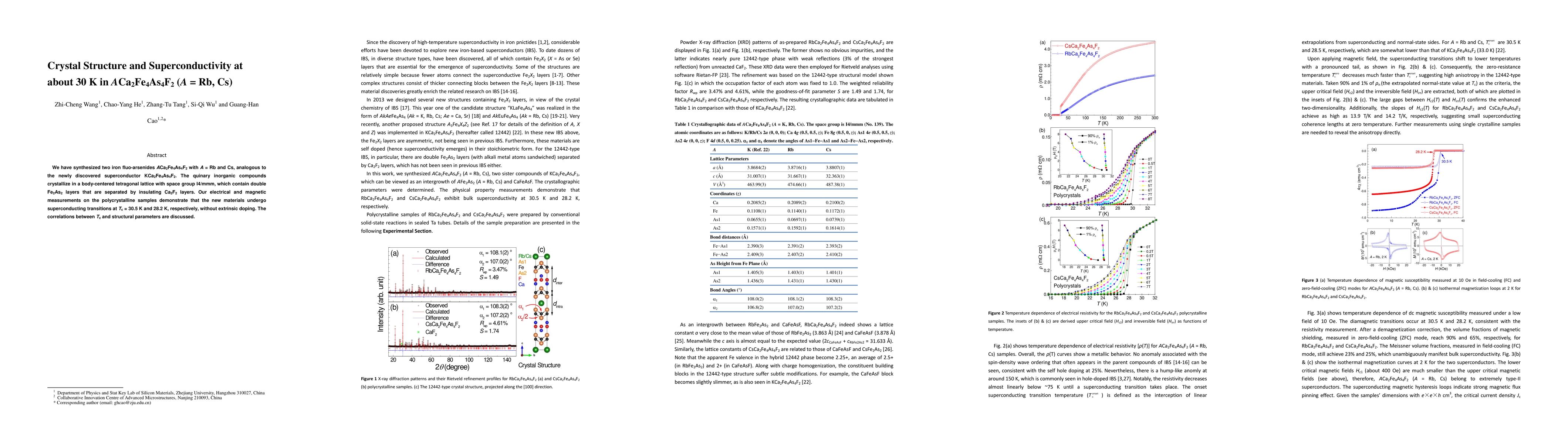 The paper reports the synthesis of RbCa$_2$Fe$_4$As$_4$F$_2$ and CsCa$_2$Fe$_4$As$_4$F$_2$, showing superconductivity at 30.5 K and 28.2 K, respectively. The materials crystallize in a body-centered tetragonal structure and exhibit double Fe$_2$As$_2$ layers separated by Ca$_2$F$_2$ layers.