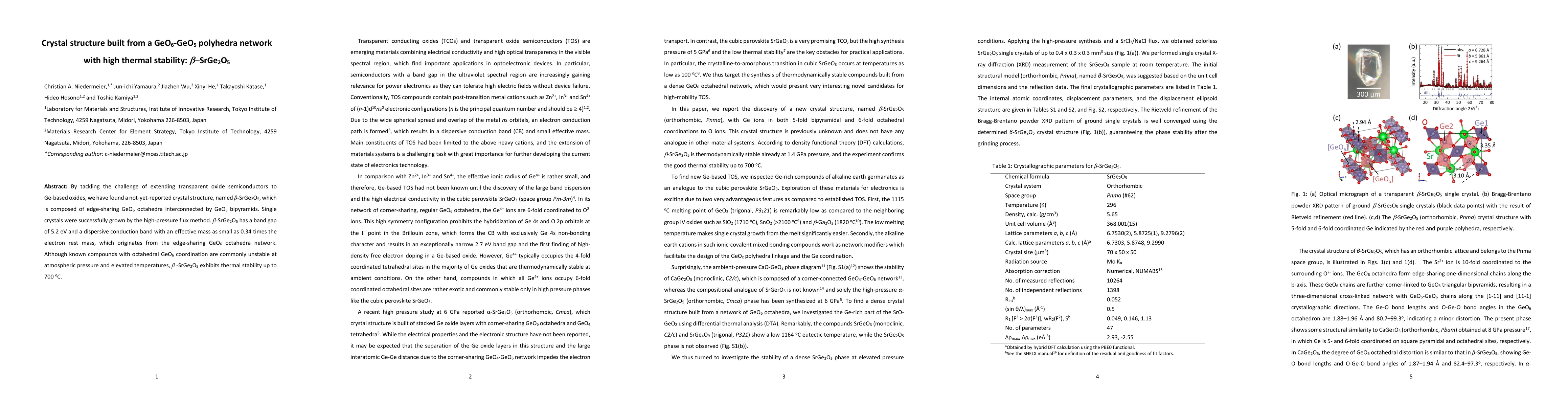 This paper reports the discovery of a novel crystal structure, $\beta$-SrGe$_2$O$_5$, composed of a network of edge-sharing GeO$_6$ octahedra and GeO$_5$ bipyramids, which exhibits high thermal stability and a band gap of 5.2 eV.