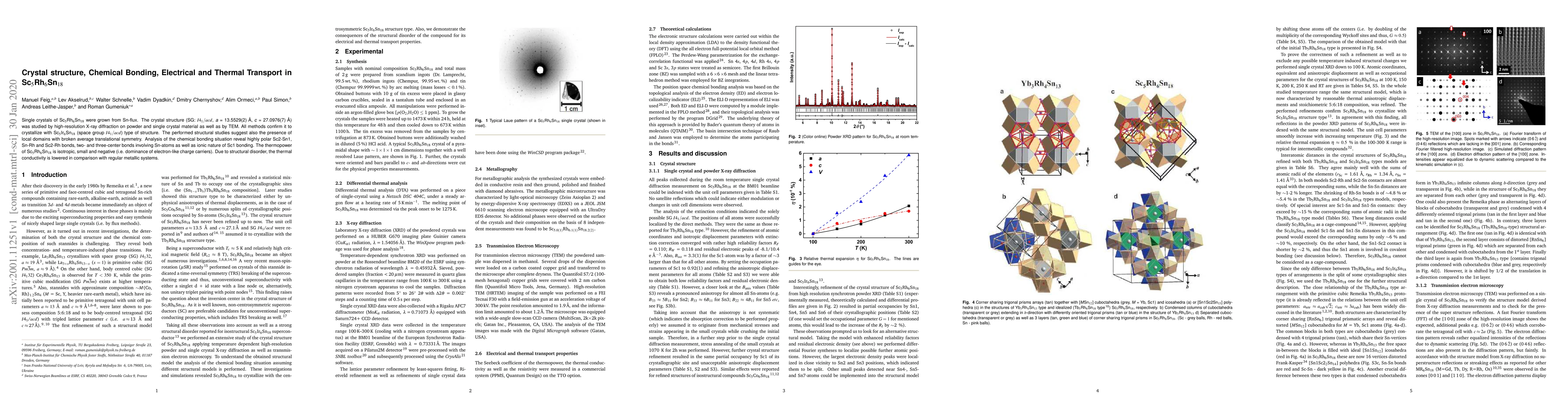 Single crystals of Sc5Rh6Sn18 exhibit a complex structure with broken translational symmetry, highly polar bonds, and negative thermopower, indicating electron-like charge carriers. The material's thermal conductivity is lowered due to structural disorder.