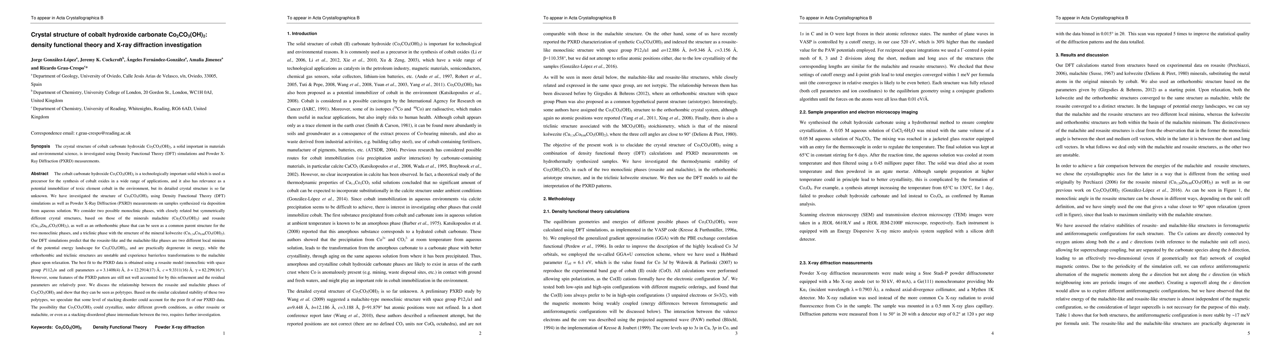 This study investigates the crystal structure of Co$_2$CO$_3$(OH)$_2$ using DFT simulations and PXRD, finding two stable monoclinic phases (rosasite-like and malachite-like) and suggesting stacking disorder may explain discrepancies in PXRD data.