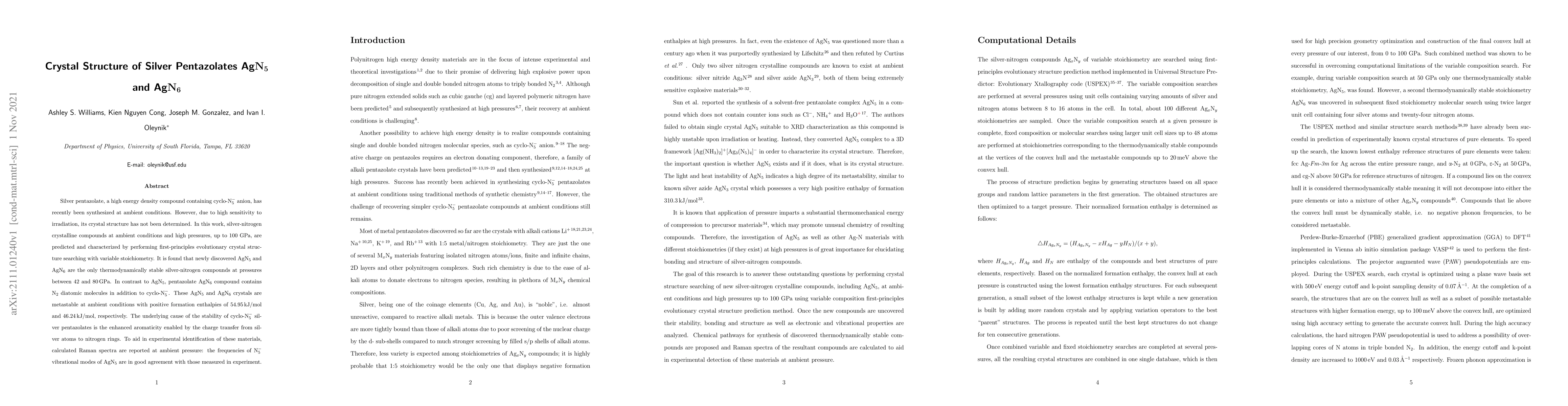 Silver pentazolate, a high energy density compound containing cyclo-N5- anion, has recently been synthesized at ambient conditions. However, due to high sensitivity to irradiation, its crystal structure has not been determined. In this work, silver-nitrogen crystalline compounds at ambient conditions and high pressures, up to 100 GPa, are predicted and characterized by performing first-principles evolutionary crystal structure searching with variable stoichiometry. It is found that newly discovered AgN5 and AgN6 are the only thermodynamically stable silver-nitrogen compounds at pressures between 42 and 80 GPa. In contrast to AgN5, pentazolate AgN6 compound contains N2 diatomic molecules in addition to cyclo-N5-. These AgN5 and AgN6 crystals are metastable at ambient conditions with positive formation enthalpies of 54.95 kJ/mol and 46.24 kJ/mol, respectively. The underlying cause of the stability of cyclo-N5- silver pentazolates is the enhanced aromaticity enabled by the charge transfer from silver atoms to nitrogen rings. To aid in experimental identification of these materials, calculated Raman spectra are reported at ambient pressure: the frequencies of N5- vibrational modes of AgN5 are in good agreement with those measured in experiment.