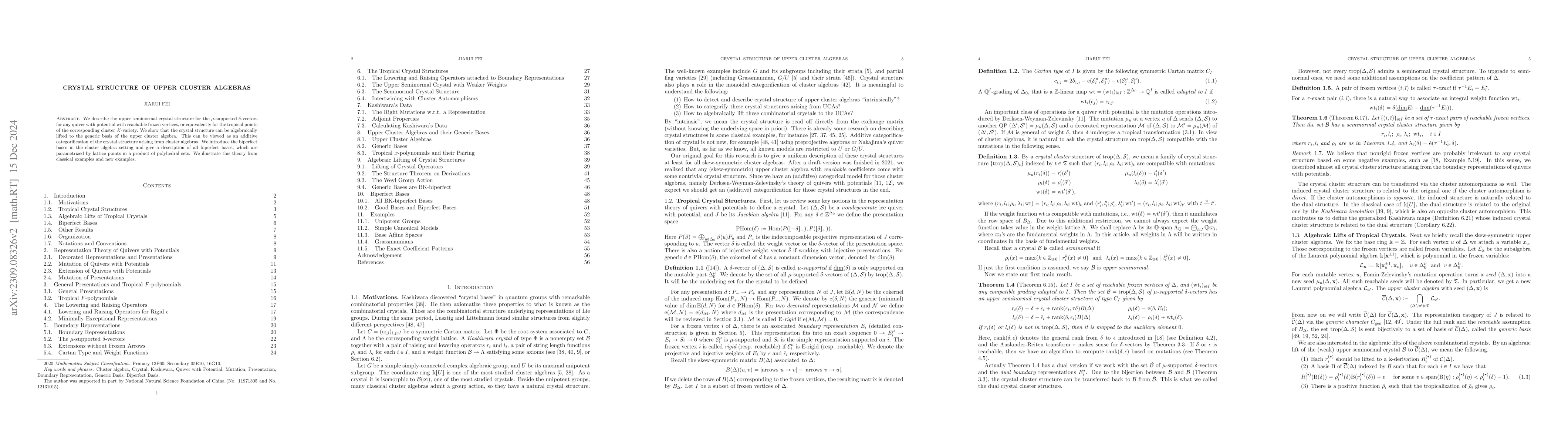 We describe the upper seminormal crystal structure for the $\mu$-supported $\delta$-vectors for any quiver with potential with reachable frozen vertices, or equivalently for the tropical points of the corresponding cluster $\mc{X}$-variety. We show that the crystal structure can be algebraically lifted to the generic basis of the upper cluster algebra. This can be viewed as an additive categorification of the crystal structure arising from cluster algebras. We introduce the biperfect bases and the strong biperfect bases in the cluster algebra setting and give a description of all (strong) biperfect bases, which are parametrized by lattice points in a product of explicit polyhedral sets. We illustrate this theory from classical examples and new examples.