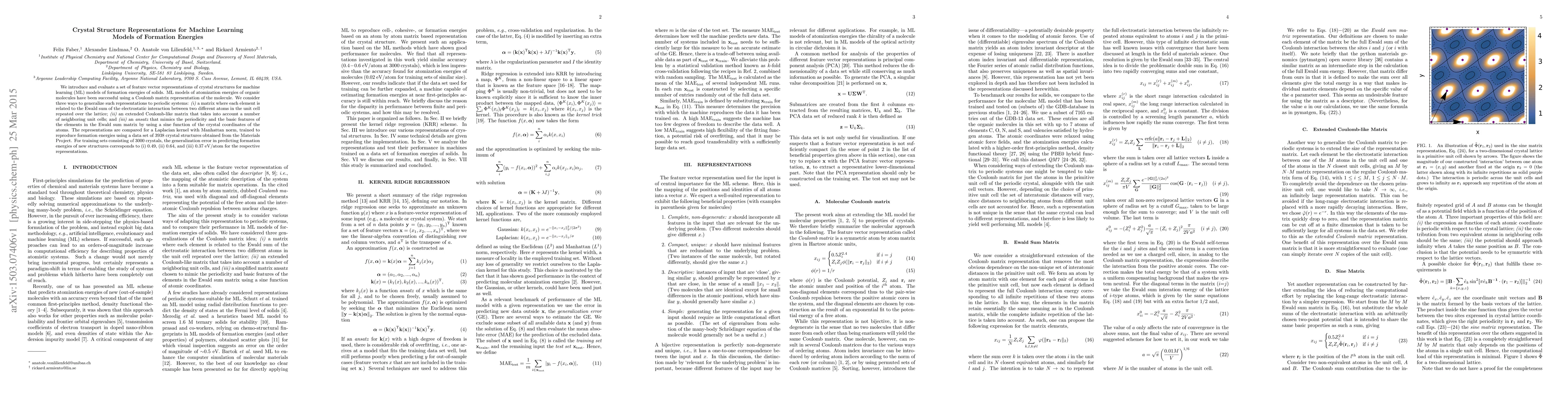 This paper proposes three feature vector representations for crystal structures to train machine learning models predicting formation energies of solids. The best performing representation, using a sine function Ansatz, achieves a generalization error of 0.37 eV/atom, outperforming the other two methods.