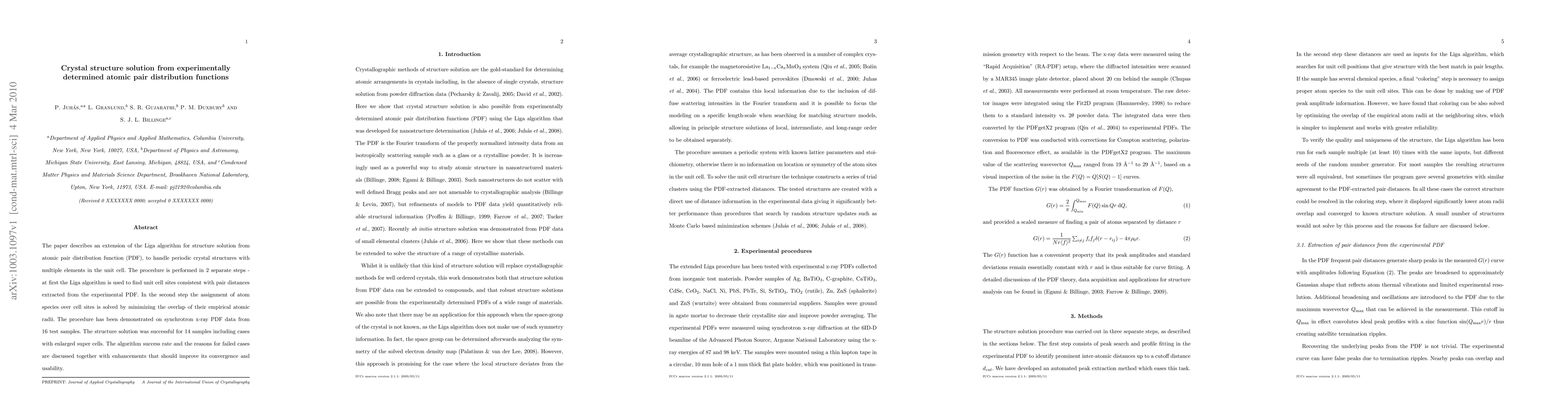 This paper extends the Liga algorithm to solve crystal structures from atomic pair distribution functions, achieving successful structure determination for 14 out of 16 test samples, including complex supercells, by minimizing atomic radii overlap after initial unit cell site identification.