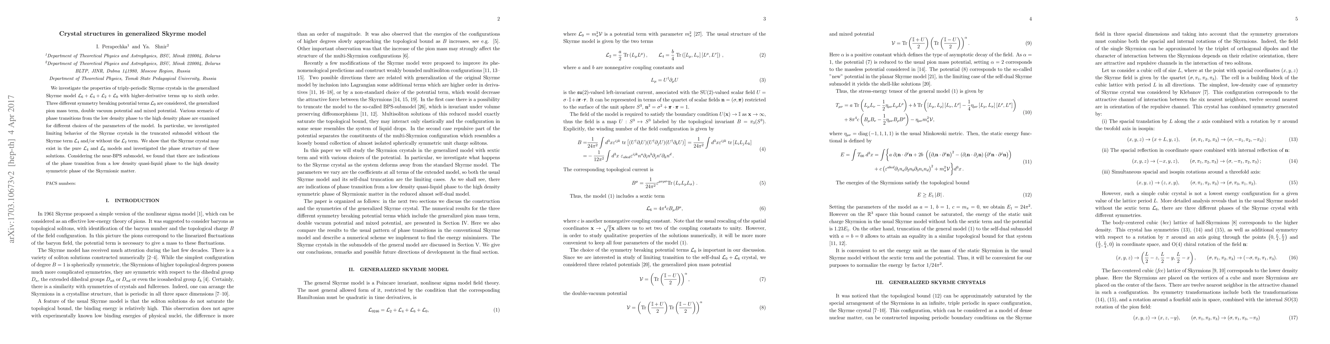 We investigate the properties of triply-periodic Skyrme crystals in the generalized Skyrme model $\mathcal{L}_6 + \mathcal{L}_4 + \mathcal{L}_2+ \mathcal{L}_0$ with higher-derivative terms up to sixth order. Three different symmetry breaking potential terms $\mathcal{L}_0$ are considered, the generalized pion mass term, double vacuum potential and mixed potential. Various scenario of phase transitions from the low density phase to the high density phase are examined for different choices of the parameters of the model. In particular, we investigated limiting behavior of the Skyrme crystals in the truncated submodel without the Skyrme term $\mathcal{L}_4$ and/or without the $\mathcal{L}_2$ term. We show that the Skyrme crystal may exist in the pure $\mathcal{L}_4$ and $\mathcal{L}_6$ models and investigated the phase structure of these solutions. Considering the near-BPS submodel, we found that there are indications of the phase transition from a low density quasi-liquid phase to the high density symmetric phase of the Skyrmionic matter.