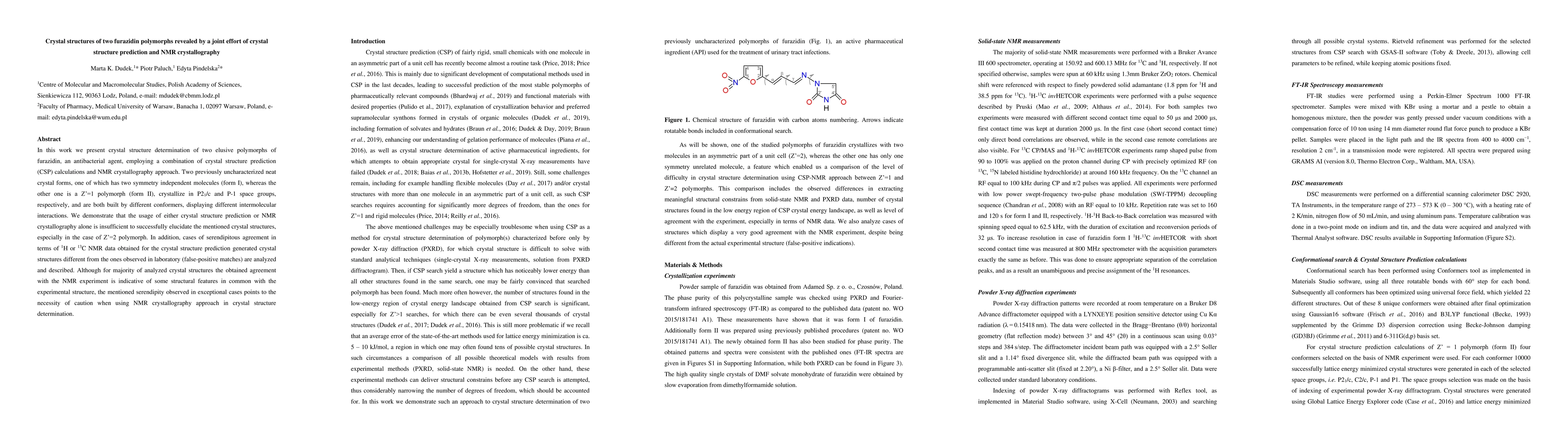 This study elucidates the crystal structures of two furazidin polymorphs using a combination of crystal structure prediction and NMR crystallography, revealing distinct intermolecular interactions and highlighting the necessity of this dual approach to avoid false-positive matches in structure determination.