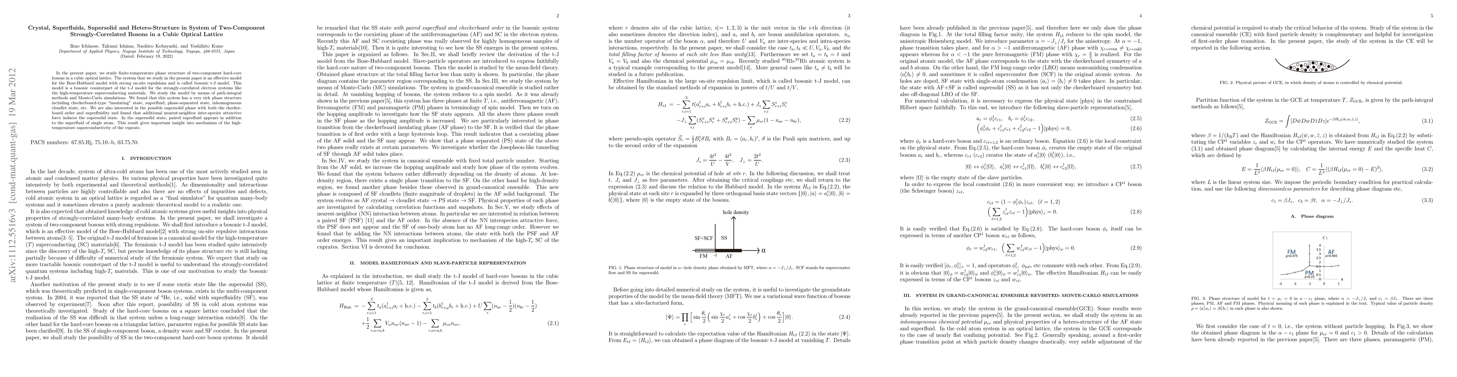 In the present paper, we study finite-temperature phase structure of two-component hard-core bosons in a cubic optical lattice. The system that we study in the present paper is an effective model for the Bose-Hubbard model with strong on-site repulsions and is called bosonic t-J model. This model is a bosonic counterpart of the t-J model for the strongly-correlated electron systems like the high-temperature superconducting materials. We study the model by means of path-integral methods and Monte-Carlo simulations. We found that this system has a very rich phase structure including checkerboard-type "insulating" state, superfluid, phase-separated state, inhomogeneous cloudlet state, etc. We are also interested in the possible supersolid phase with both the checkerboard order and superfluidity and found that additional nearest-neighbor inter-species attractive force induces the supersolid state. In the supersolid state, paired superfluid appears in addition to the superfluid of single atom. This result gives important insight into mechanism of the high-temperature superconductivity of the cuprate.