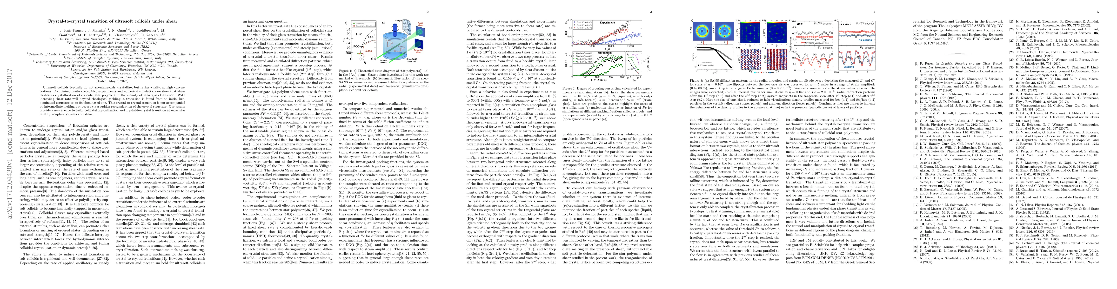 This study reveals that shear can induce crystallization in ultrasoft colloidal star polymers near their glass transition, transitioning from a bcc to an fcc structure without intermediate melting. The findings suggest a new method to control colloidal crystallization and crystal transitions using shear and softness.