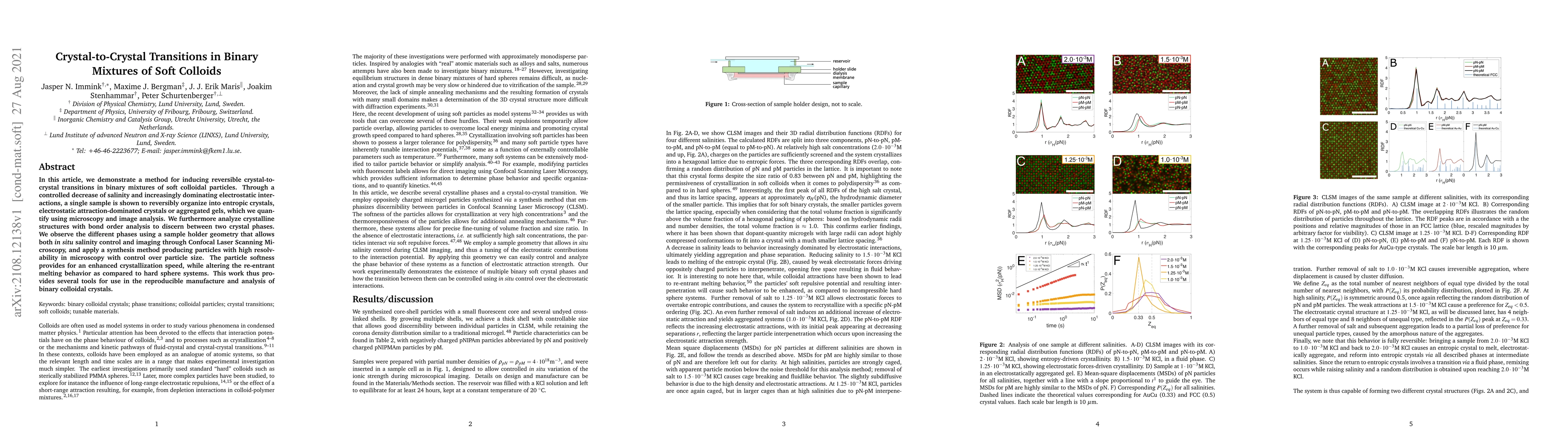 This paper demonstrates a method to induce reversible crystal-to-crystal transitions in binary mixtures of soft colloidal particles via salinity control, revealing distinct entropic and electrostatic phases. The study employs microscopy and bond order analysis to characterize the crystalline structures and provides tools for reproducible colloidal crystal manufacturing.