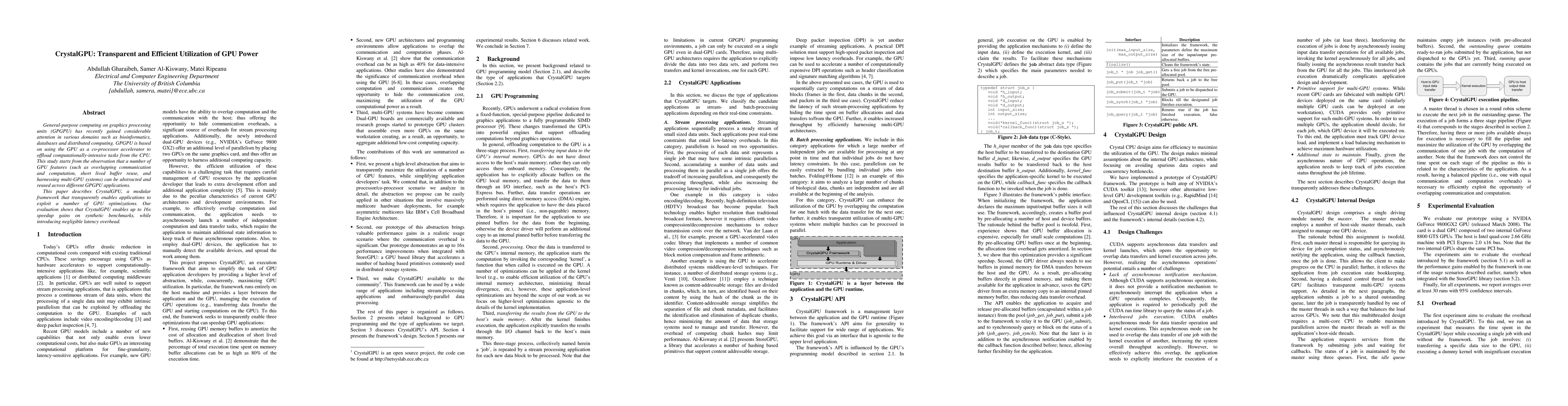 General-purpose computing on graphics processing units (GPGPU) has recently gained considerable attention in various domains such as bioinformatics, databases and distributed computing. GPGPU is based on using the GPU as a co-processor accelerator to offload computationally-intensive tasks from the CPU. This study starts from the observation that a number of GPU features (such as overlapping communication and computation, short lived buffer reuse, and harnessing multi-GPU systems) can be abstracted and reused across different GPGPU applications. This paper describes CrystalGPU, a modular framework that transparently enables applications to exploit a number of GPU optimizations. Our evaluation shows that CrystalGPU enables up to 16x speedup gains on synthetic benchmarks, while introducing negligible latency overhead.