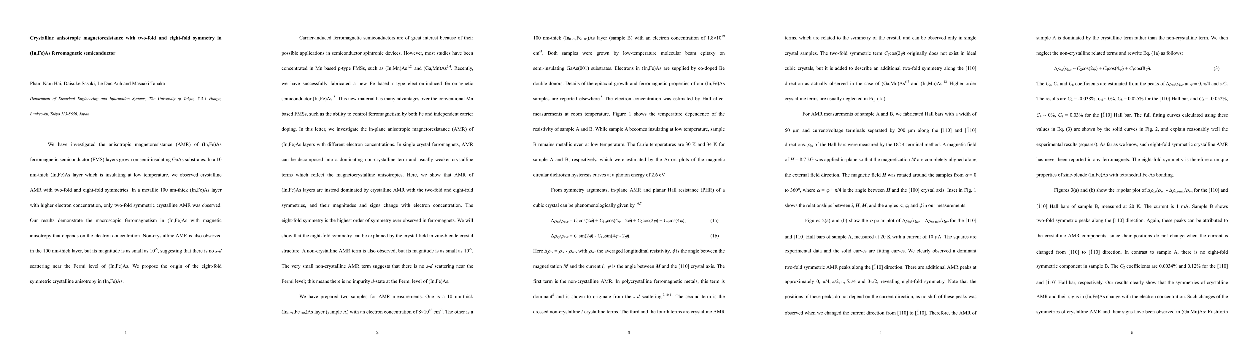 We have investigated the anisotropic magnetoresistance (AMR) of (In,Fe)As ferromagnetic semiconductor (FMS) layers grown on semi-insulating GaAs substrates. In a 10 nm-thick (In,Fe)As layer which is insulating at low temperature, we observed crystalline AMR with two-fold and eight-fold symmetries. In a metallic 100 nm-thick (In,Fe)As layer with higher electron concentration, only two-fold symmetric crystalline AMR was observed. Our results demonstrate the macroscopic ferromagnetism in (In,Fe)As with magnetic anisotropy that depends on the electron concentration. Non-crystalline AMR is also observed in the 100 nm-thick layer, but its magnitude is as small as 10^-5, suggesting that there is no s-d scattering near the Fermi level of (In,Fe)As. We propose the origin of the eight-fold symmetric crystalline anisotropy in (In,Fe)As.