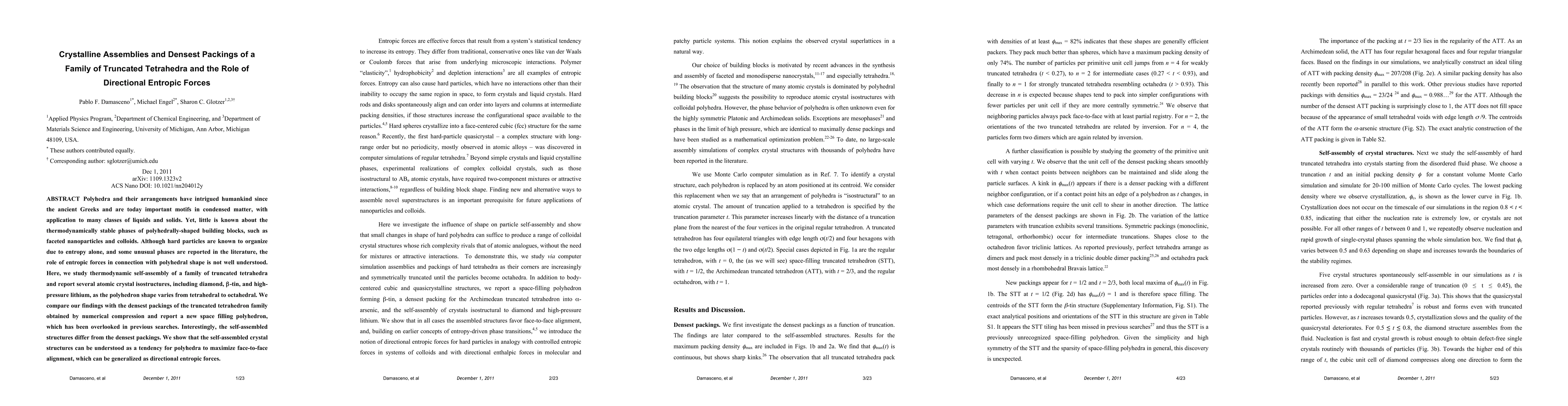This paper investigates the thermodynamic self-assembly of truncated tetrahedra, revealing several crystal isostructures and highlighting the role of directional entropic forces in shaping these polyhedral assemblies. The study finds that self-assembled structures differ from densest packings, emphasizing face-to-face alignment as a key factor.