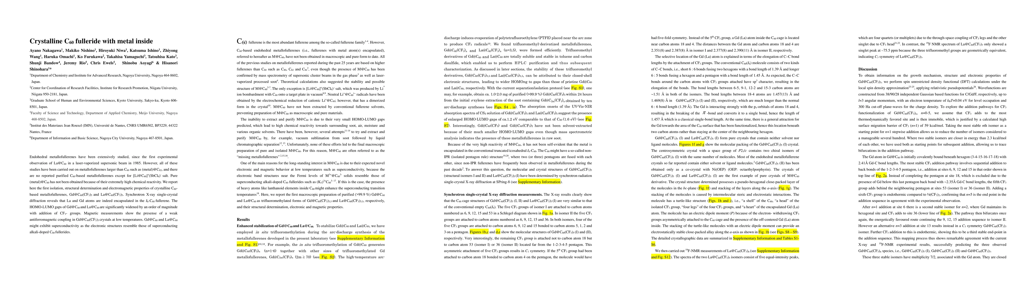Endohedral metallofullerenes have been extensively studied, since the first experimental observation of La@C60 in a laser-vaporized supersonic beam in 1985. However, all of these studies have been carried out on metallofullerenes larger than C60 such as (metal)@C82, and there are no reported purified C60-based metallofullerenes except for [Li@C60]+(SbCl6)- salt. Pure (metal)@C60 has not been obtained because of their extremely high chemical reactivity. We report here the first isolation, structural determination and electromagnetic properties of crystalline C60-based metallofullerenes, Gd@C60(CF3)5 and La@C60(CF3)5. Synchrotron X-ray single-crystal diffraction reveals that La and Gd atoms are indeed encapsulated in the Ih-C60 fullerene. The HOMO-LUMO gaps of Gd@C60 and La@C60 are significantly widened by an order of magnitude with addition of CF3- groups. Magnetic measurements show the presense of a weak antiferromagnetic coupling in Gd@C60(CF3)3 crystals at low temperatures. Gd@C60 and La@C60 might exhibit superconductivity as the electronic structures resemble those of superconducting alkali-doped C60 fullerides.