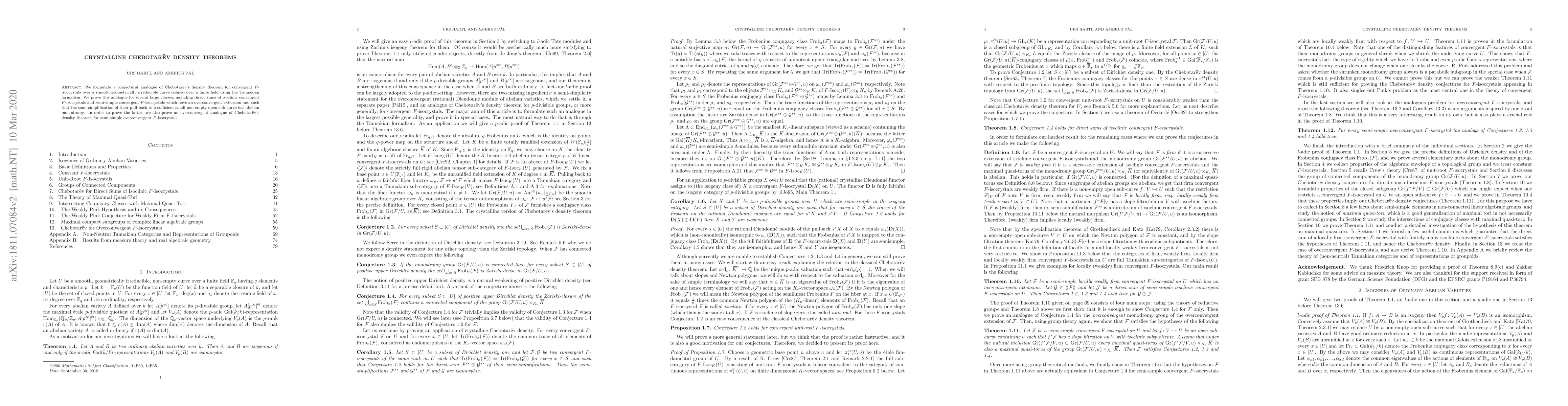 This paper proposes a conjectured analogue of Chebotar\'ev's density theorem for convergent $F$-isocrystals over finite fields, and proves this analogue for specific classes of isocrystals using Tannakian formalism and overconvergent techniques. The proof also includes an overconvergent version of Chebotar\'ev's theorem for semi-simple isocrystals.