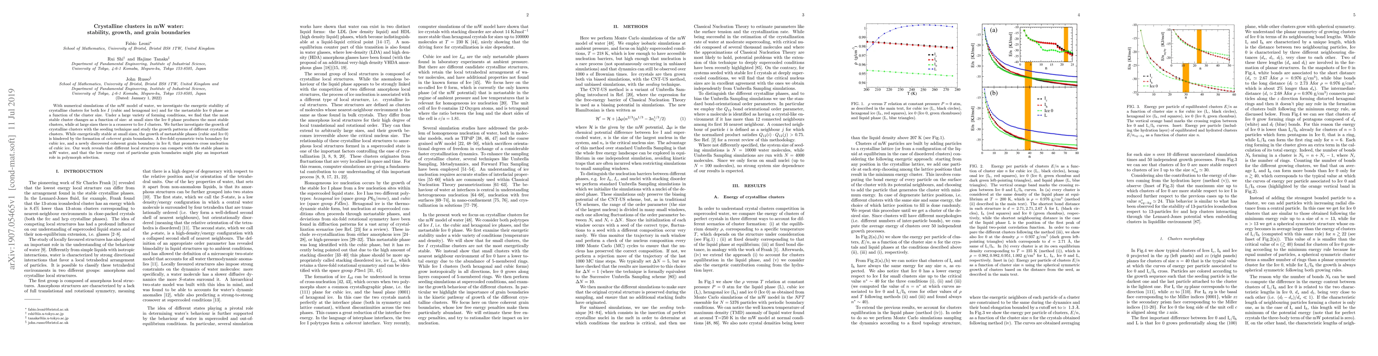 This paper uses numerical simulations to study the stability and growth of crystalline water clusters in the mW model, finding that the most stable cluster type changes with size, with Ice 0 being most stable at small sizes and Ice I at larger sizes. It also reveals that grain boundaries hinder the growth of metastable phases, influencing polymorph selection.