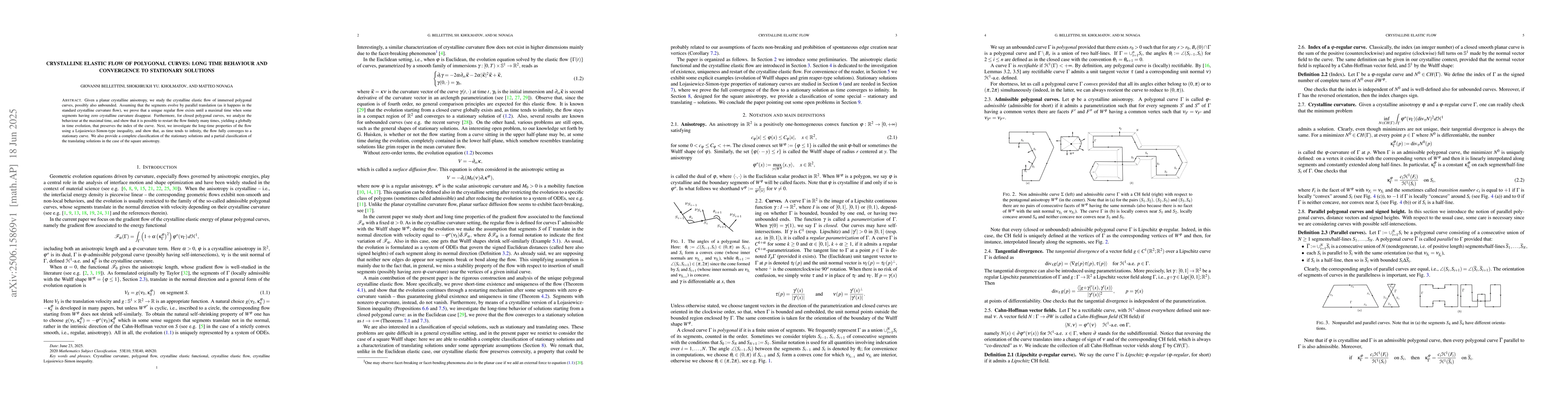 Given a planar crystalline anisotropy, we study the crystalline elastic flow of immersed polygonal curves, possibly also unbounded. Assuming that the segments evolve by parallel translation (as it happens in the standard crystalline curvature flow), we prove that a unique regular flow exists until a maximal time when some segments having zero crystalline curvature disappear. Furthermore, for closed polygonal curves, we analyze the behaviour at the maximal time, and show that it is possible to restart the flow finitely many times, yielding a globally in time evolution, that preserves the index of the curve. Next, we investigate the long-time properties of the flow using a Lojasiewicz-Simon-type inequality, and show that, as time tends to infinity, the flow fully converges to a stationary curve. We also provide a complete classification of the stationary solutions and a partial classification of the translating solutions in the case of the square anisotropy.