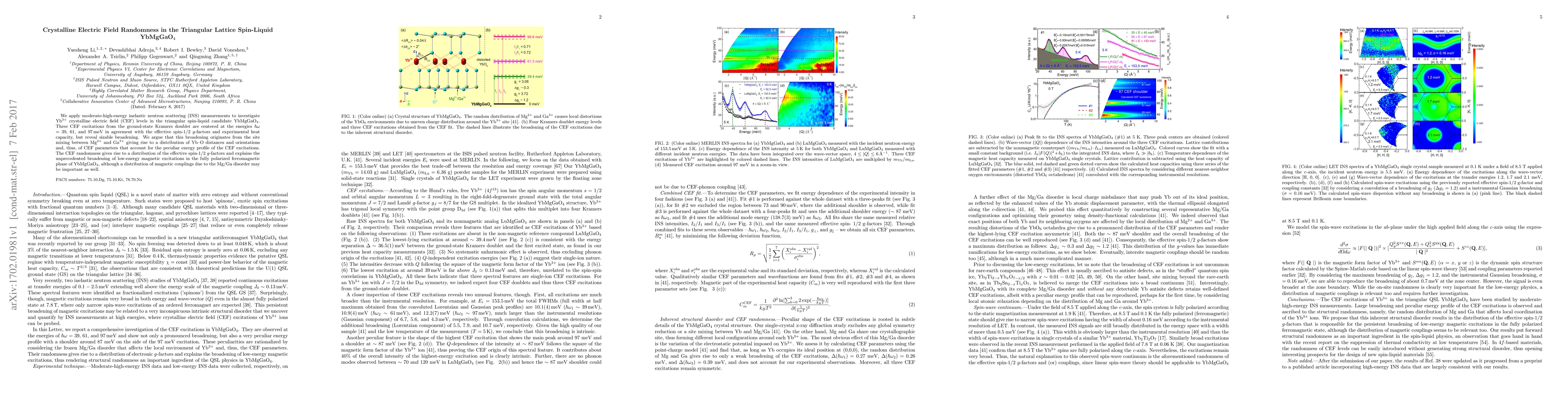 We apply moderate-high-energy inelastic neutron scattering (INS) measurements to investigate Yb$^{3+}$ crystalline electric field (CEF) levels in the triangular spin-liquid candidate YbMgGaO$_4$. Three CEF excitations from the ground-state Kramers doublet are centered at the energies $\hbar \omega$ = 39, 61, and 97\,meV in agreement with the effective \mbox{spin-1/2} $g$-factors and experimental heat capacity, but reveal sizable broadening. We argue that this broadening originates from the site mixing between Mg$^{2+}$ and Ga$^{3+}$ giving rise to a distribution of Yb--O distances and orientations and, thus, of CEF parameters that account for the peculiar energy profile of the CEF excitations. The CEF randomness gives rise to a distribution of the effective spin-1/2 $g$-factors and explains the unprecedented broadening of low-energy magnetic excitations in the fully polarized ferromagnetic phase of YbMgGaO$_4$, although a distribution of magnetic couplings due to the Mg/Ga disorder may be important as well.