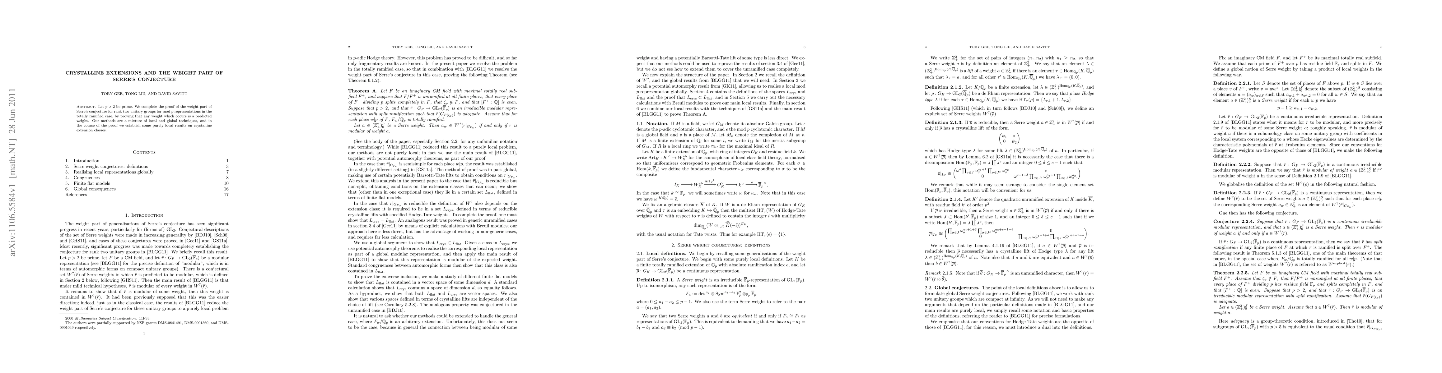 This paper completes the proof of the weight part of Serre's conjecture for rank two unitary groups in the totally ramified case, confirming that predicted weights occur. The proof combines local and global techniques, and introduces new local results on crystalline extension classes.
