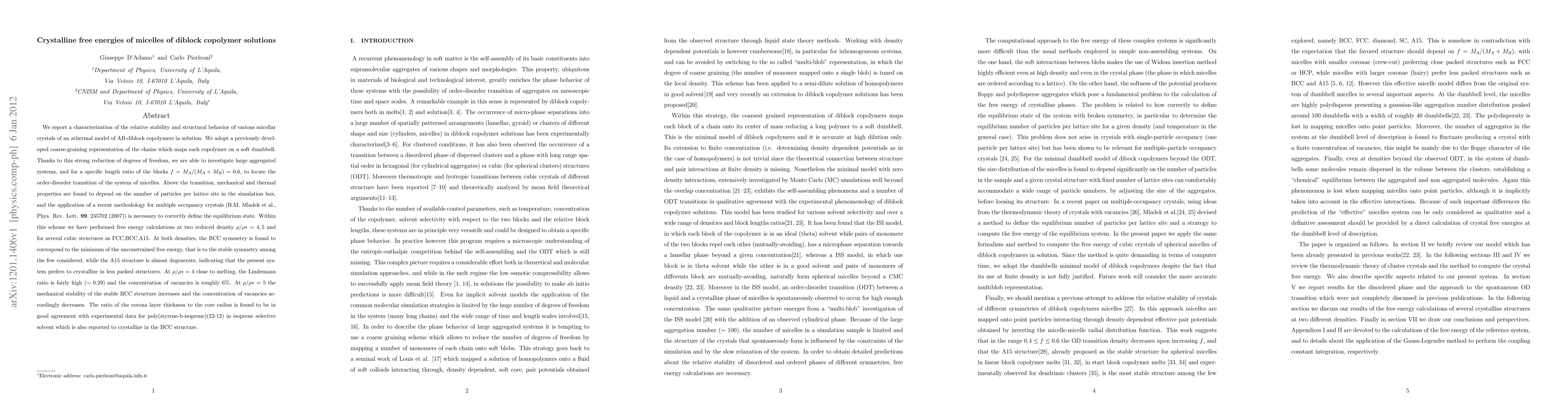 We report a characterization of the relative stability and structural behavior of various micellar crystals of an athermal model of AB-diblock copolymers in solution. We adopt a previously devel- oped coarse-graining representation of the chains which maps each copolymer on a soft dumbbell. Thanks to this strong reduction of degrees of freedom, we are able to investigate large aggregated systems, and for a specific length ratio of the blocks f = MA/(MA + MB) = 0.6, to locate the order-disorder transition of the system of micelles. Above the transition, mechanical and thermal properties are found to depend on the number of particles per lattice site in the simulation box, and the application of a recent methodology for multiple occupancy crystals (B.M. Mladek et al., Phys. Rev. Lett. 99, 235702 (2007)) is necessary to correctly define the equilibrium state. Within this scheme we have performed free energy calculations at two reduced density {\rho}/{\rho}\ast = 4,5 and for several cubic structures as FCC,BCC,A15. At both densities, the BCC symmetry is found to correspond to the minimum of the unconstrained free energy, that is to the stable symmetry among the few considered, while the A15 structure is almost degenerate, indicating that the present sys- tem prefers to crystallize in less packed structures. At {\rho}/{\rho}\ast = 4 close to melting, the Lindemann ratio is fairly high (~ 0.29) and the concentration of vacancies is roughly 6%. At {\rho}/{\rho}\ast = 5 the mechanical stability of the stable BCC structure increases and the concentration of vacancies ac- cordingly decreases. The ratio of the corona layer thickness to the core radius is found to be in good agreement with experimental data for poly(styrene-b-isoprene)(22-12) in isoprene selective solvent which is also reported to crystallize in the BCC structure.