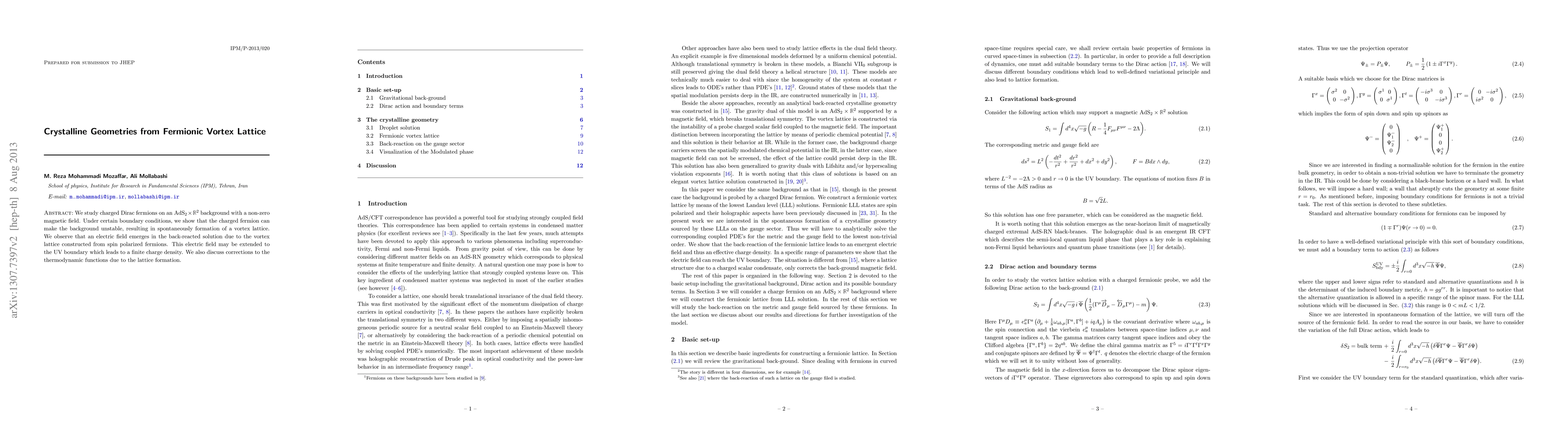 This paper investigates charged Dirac fermions in an AdS$_2\times R^2$ background under a non-zero magnetic field, revealing the spontaneous formation of a vortex lattice that destabilizes the background. The lattice induces an electric field extending to the UV boundary, resulting in a finite charge density and corrections to thermodynamic functions.