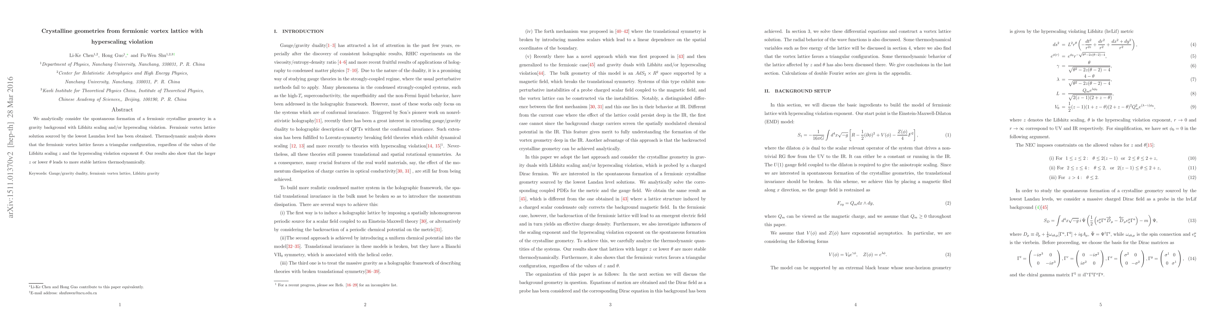 We analytically consider the spontaneous formation of a fermionic crystalline geometry in a gravity background with Lifshitz scaling and/or hyperscaling violation. Fermionic vortex lattice solution sourced by the lowest Laundau level has been obtained. Thermodynamic analysis shows that the fermionic vortex lattice favors a triangular configuration, regardless of the values of the Lifshitz scaling $z$ and the hyperscaling violation exponent $\theta$. Our results also show that the larger $z$ or lower $\theta$ leads to more stable lattices thermodynamically.