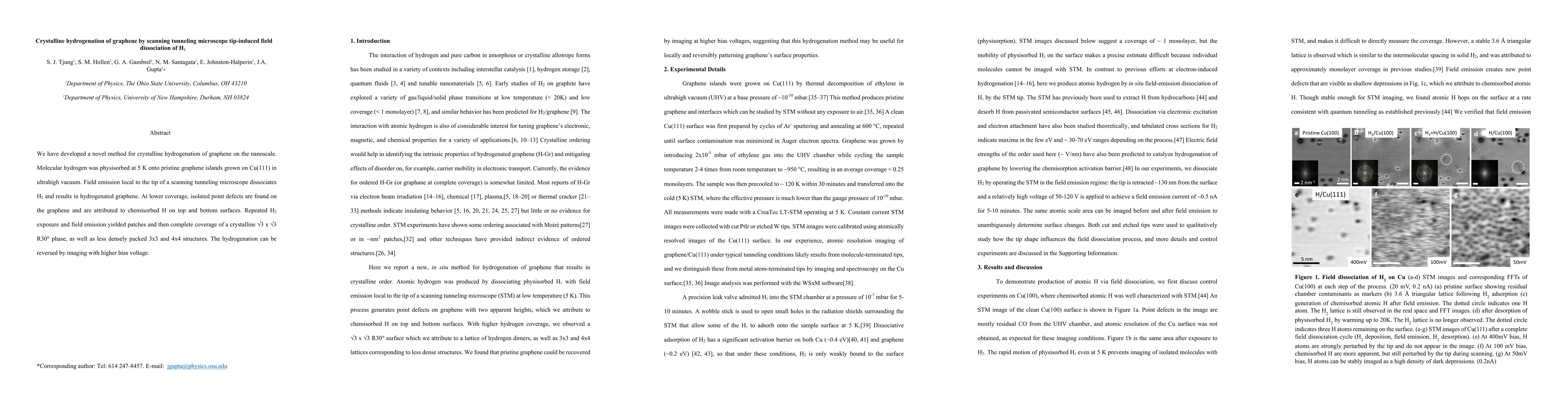We have developed a novel method for crystalline hydrogenation of graphene on the nanoscale. Molecular hydrogen was physisorbed at 5 K onto pristine graphene islands grown on Cu(111) in ultrahigh vacuum. Field emission local to the tip of a scanning tunneling microscope dissociates H$_2$ and results in hydrogenated graphene. At lower coverage, isolated point defects are found on the graphene and are attributed to chemisorbed H on top and bottom surfaces. Repeated H$_2$ exposure and field emission yielded patches and then complete coverage of a crystalline $\sqrt{3}$ $\times$ $\sqrt{3}$ R30{\deg} phase, as well as less densely packed 3 $\times$ 3 and 4 $\times$ 4 structures. The hydrogenation can be reversed by imaging with higher bias voltage.