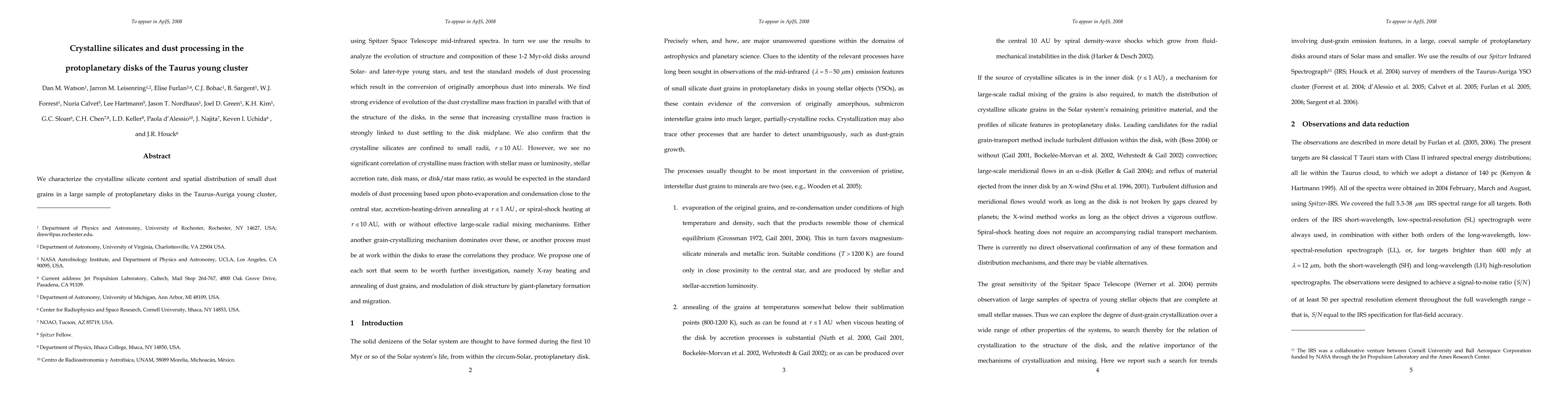 This paper investigates the crystalline silicate content and spatial distribution in protoplanetary disks in the Taurus-Auriga young cluster using Spitzer Space Telescope data. It finds a strong correlation between the crystalline mass fraction and dust settling to the disk midplane, but no significant correlation with stellar properties, suggesting alternative mechanisms like X-ray heating and giant-planet formation may influence dust crystallization.