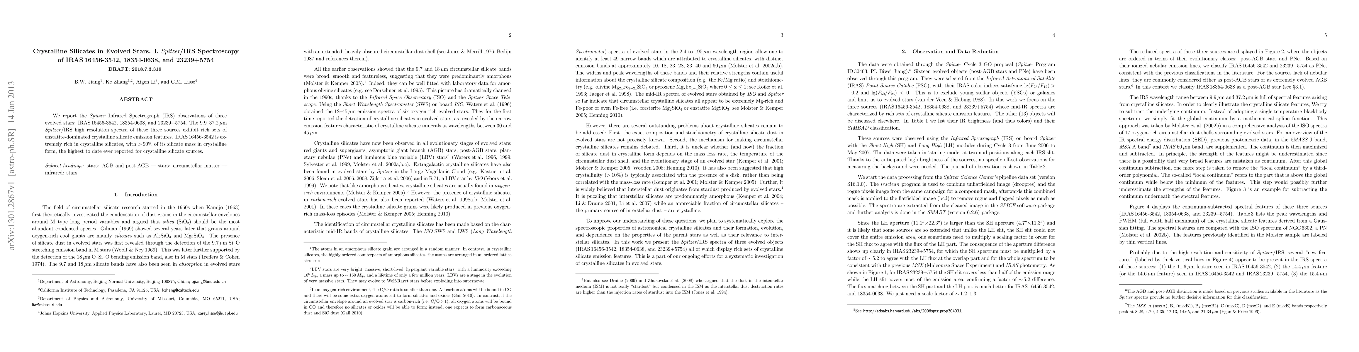 The research utilized Spitzer Infrared Spectrograph (IRS) observations to study the crystalline silicate emission features in evolved stars, specifically IRAS 16456-3542, 18354-0638, and 23239+5754.