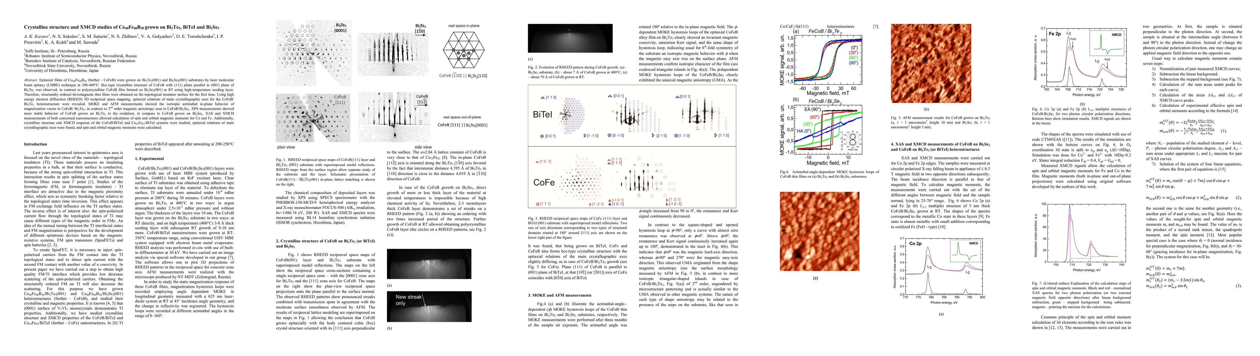 Epitaxial films of Co40Fe40B20 (further - CoFeB) were grown on Bi2Te3(001) and Bi2Se3(001) substrates by laser molecular beam epitaxy (LMBE) technique at 200-400C. Bcc-type crystalline structure of CoFeB with (111) plane parallel to (001) plane of Bi2Te3 was observed, in contrast to polycrystalline CoFeB film formed on Bi2Se3(001) at RT using high-temperature seeding layer. Therefore, structurally ordered ferromagnetic thin films were obtained on the topological insulator surface for the first time. Using high energy electron diffraction (RHEED) 3D reciprocal space mapping, epitaxial relations of main crystallographic axes for the CoFeB/ Bi2Te3 heterostructure were revealed. MOKE and AFM measurements showed the isotropic azimuthal in-plane behavior of magnetization vector in CoFeB/ Bi2Te3, in contrast to 2nd order magnetic anisotropy seen in CoFeB/Bi2Se3. XPS measurements showed more stable behavior of CoFeB grown on Bi2Te3 to the oxidation, in compare to CoFeB grown on Bi2Se3. XAS and XMCD measurements of both concerned nanostructures allowed calculation of spin and orbital magnetic moments for Co and Fe. Additionally, crystalline structure and XMCD response of the CoFeB/BiTeI and Co55Fe45/BiTeI systems were studied, epitaxial relations of main crystallographic axes were found, and spin and orbital magnetic moments were calculated.